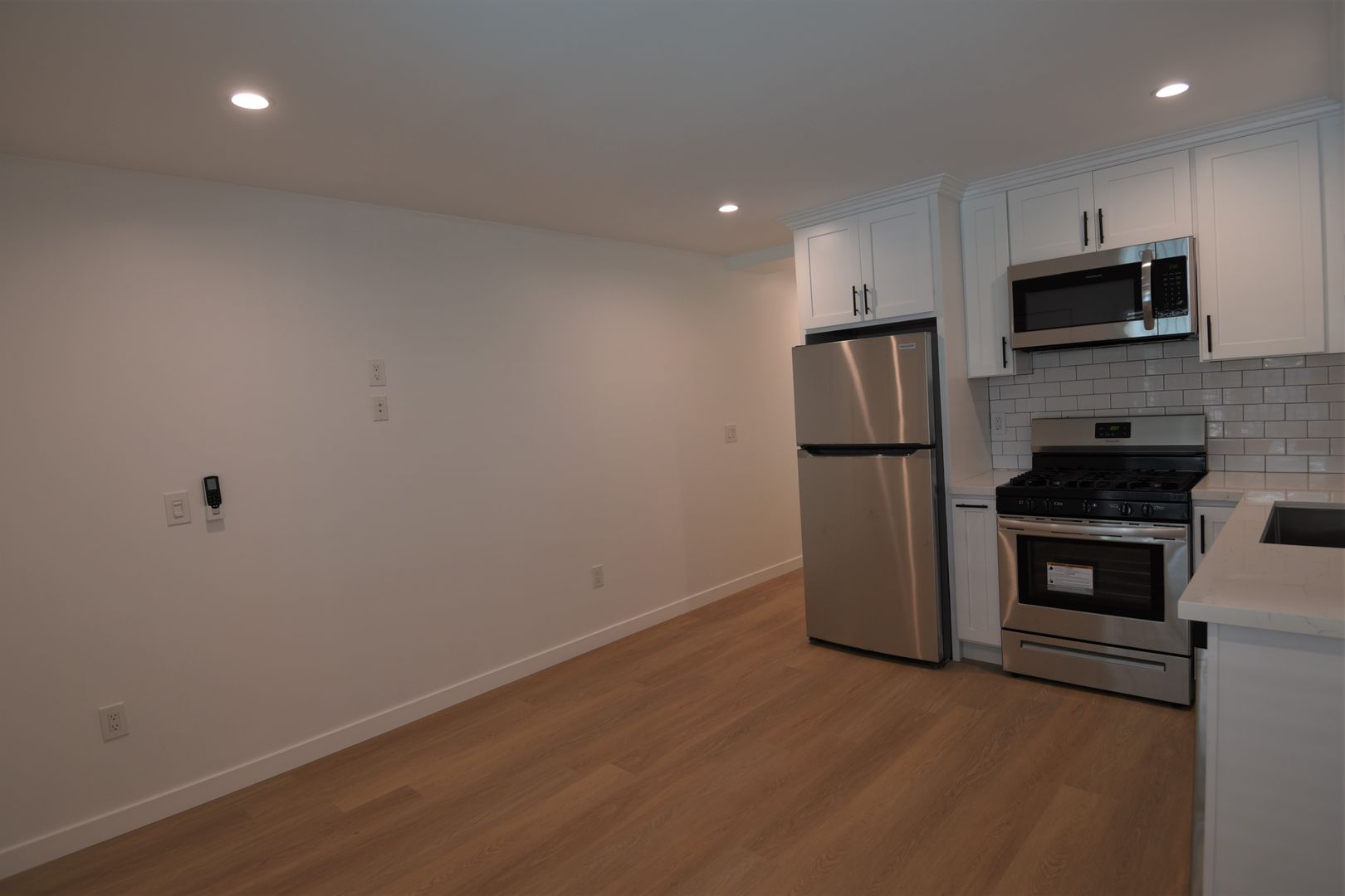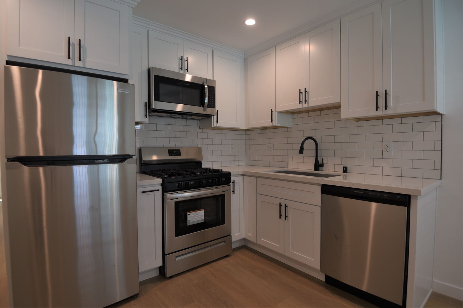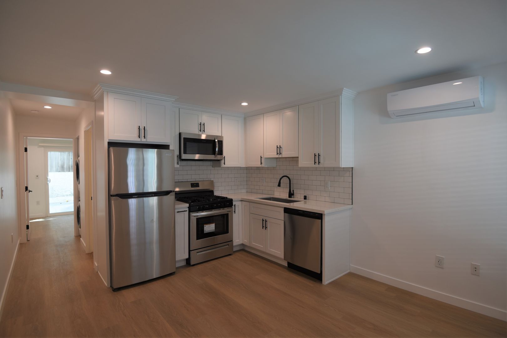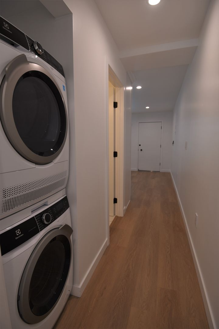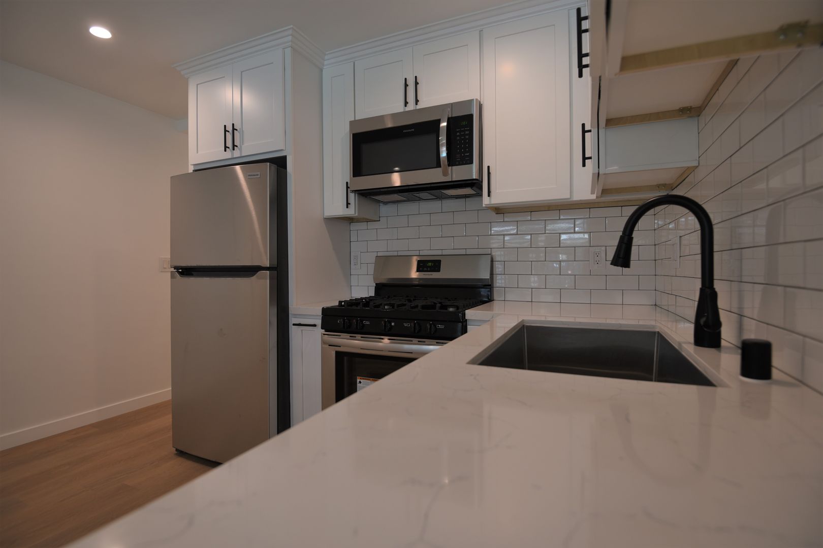 The kitchen is a chef's dream, boasting sleek stainless-steel appliances, a spacious countertop, and a subway tiled backsplash that gives a contemporary edge to the room. The kitchen opens up to the living room, making it an ideal space for entertaining guests. The washer and dryer make laundry day a breeze.