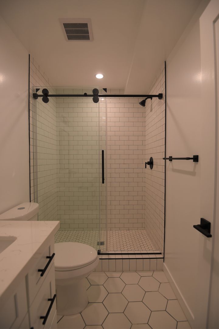 The bathroom is a spa-like sanctuary with a subway tile glass shower and hexagonal tile floors that add a touch of elegance to the space. With modern fixtures and sleek finishes, this bathroom is the epitome of style and comfort.