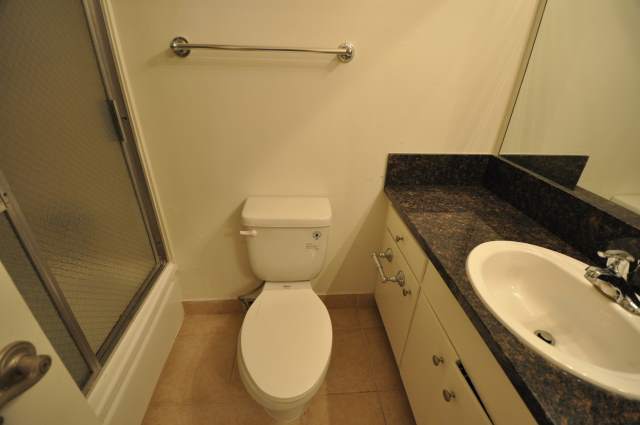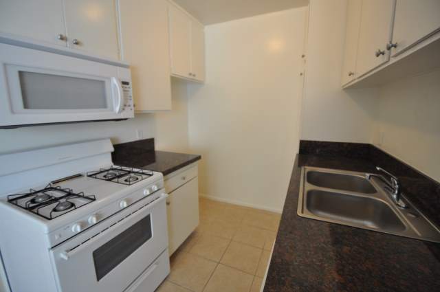 Inside, the apartment features hardwood-style flooring throughout, with beige tile in the kitchen and bathroom for added durability. The kitchen is equipped with rose granite countertops and includes a gas stove and micro hood, offering a functional and stylish cooking space.
