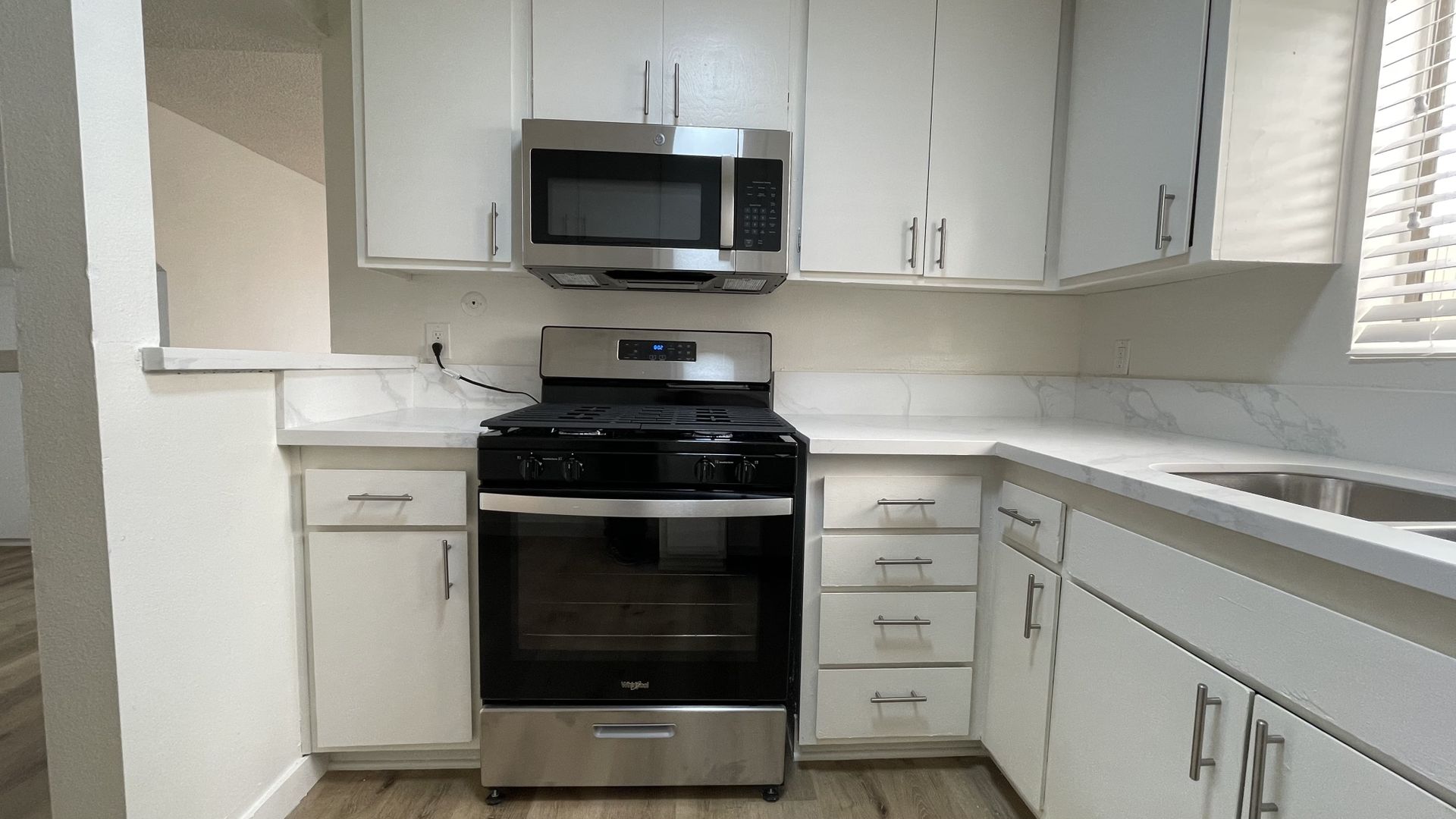 The kitchen is designed for both style and functionality, showcasing quartz countertops, stainless steel appliances including a stove, microhood, dishwasher, and refrigerator, along with generous counterspace and abundant cabinetry. A dining area sits just off the kitchen and includes a tucked-away storage closet, perfect for keeping your space organized. The king-sized bedroom features a wardrobe closet, providing plenty of storage for everyday living.