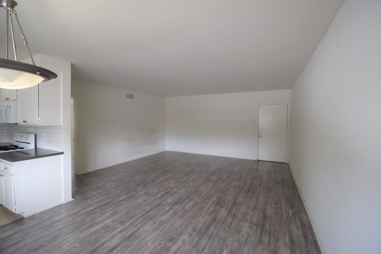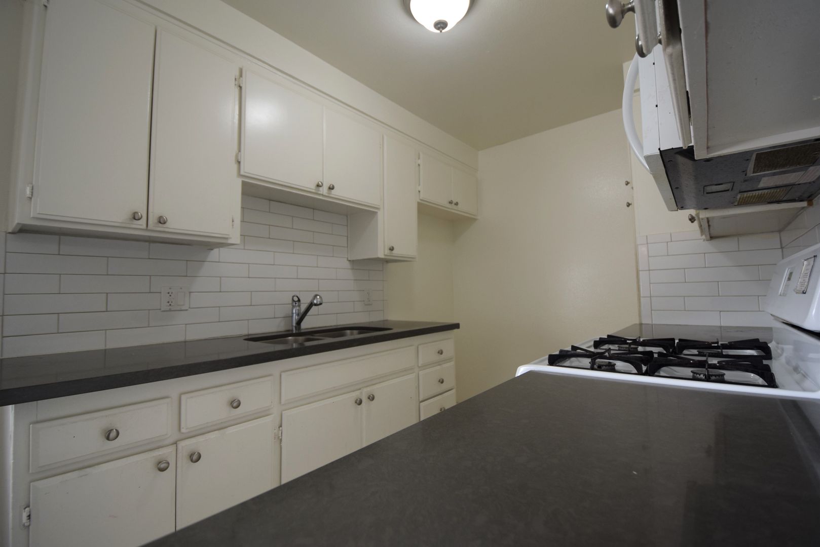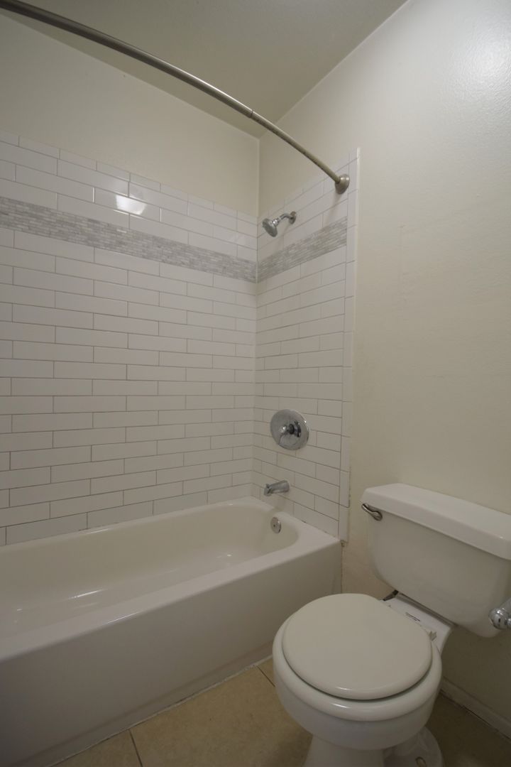 Inside, you’ll find hardwood-style flooring paired with tile in the kitchen and bathroom, creating a clean and modern feel throughout. The kitchen features quartz countertops, a gas stove, and ample cabinet space for everyday storage and cooking. A subway-tiled shower adds a fresh, updated touch to the bathroom.