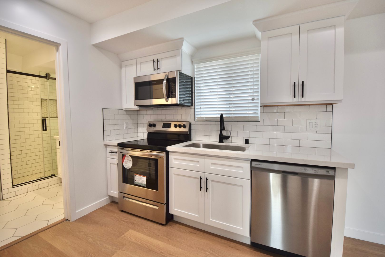 This wonderful unit offers a prime location in Walnut Villas, a charming building near downtown Newhall. With contemporary touches like Calacatta marble quartz counters, stainless steel appliances, and subway tiled backsplashes, this apartment exudes modern elegance. Enjoy the convenience of being the first to reside in this fresh space, featuring whitewash hardwood style floors and hexagonal tile flooring in the bath.