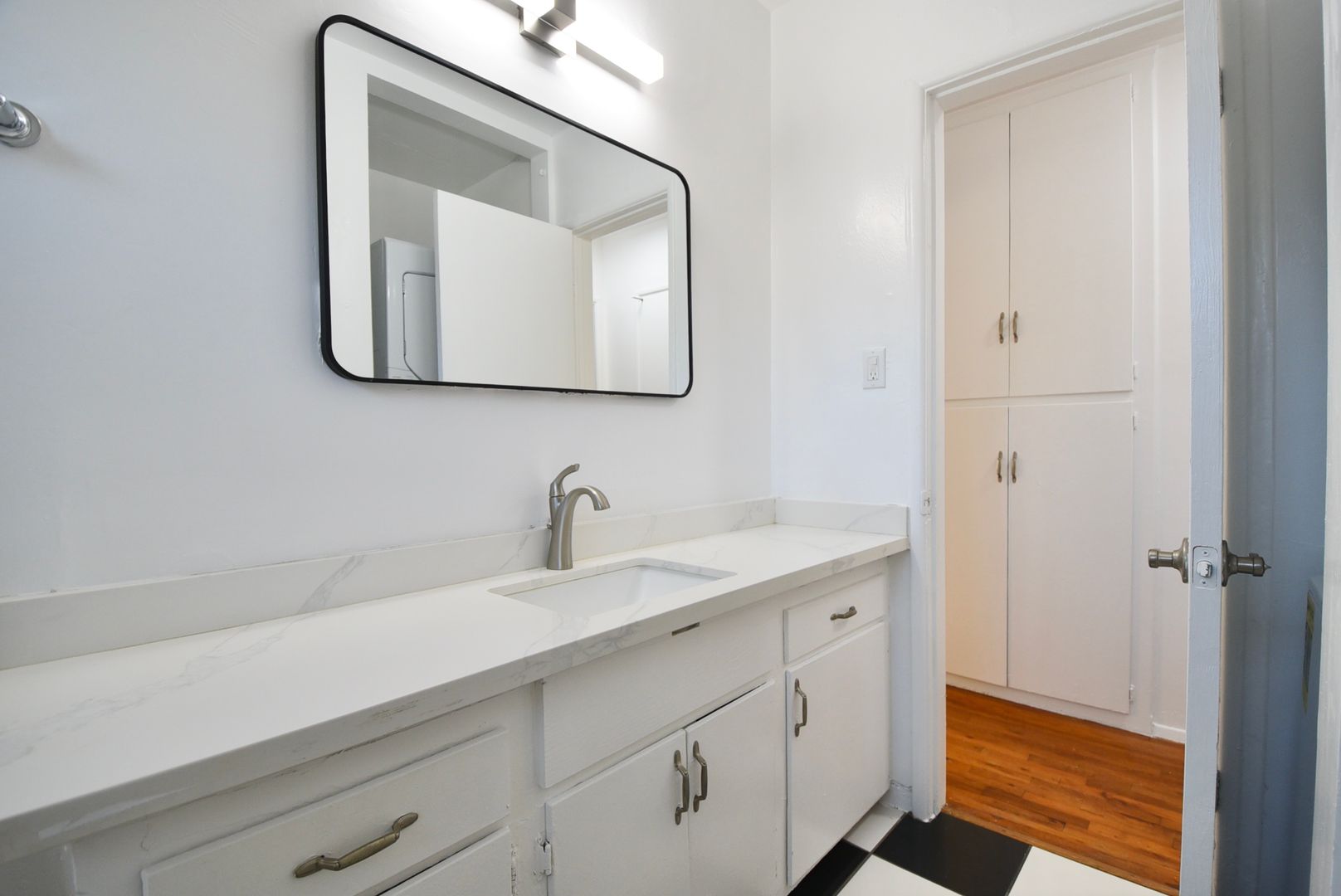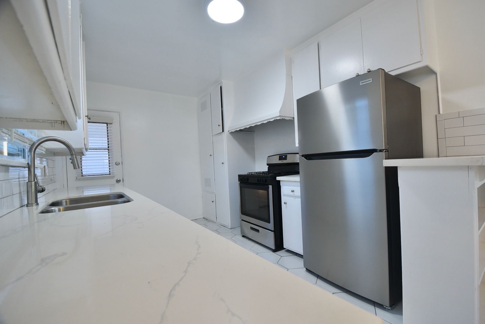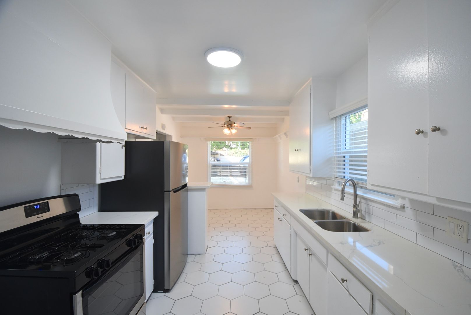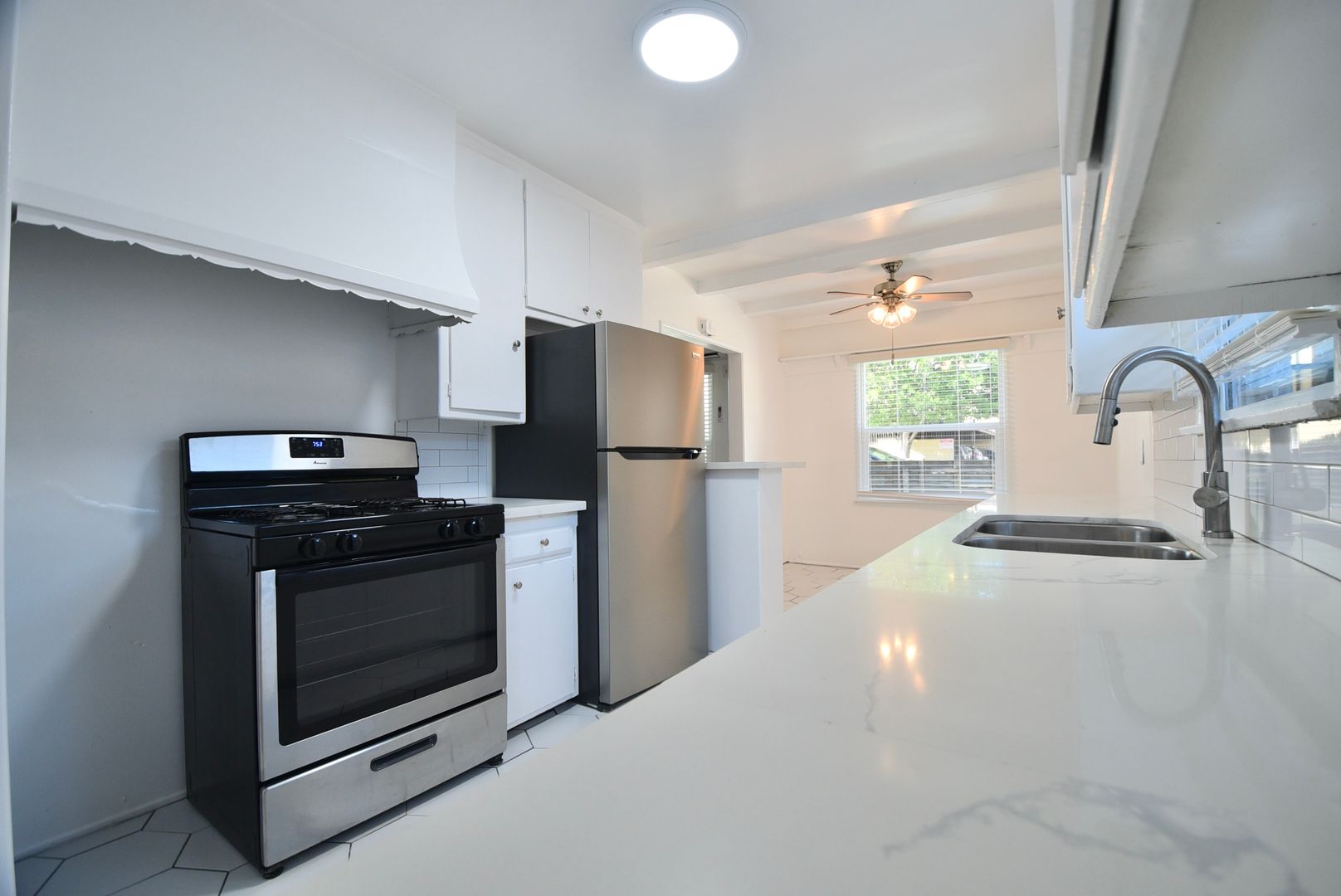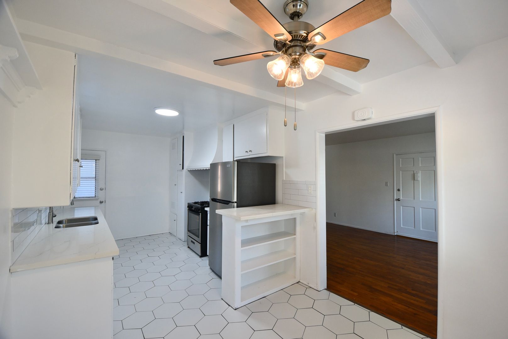Step into the charm of Valley Village living with this spacious one-bedroom apartment that blends timeless character with everyday comfort. Original hardwood floors glow under the warmth of wood-beam ceilings, while the kitchen’s calacatta marble quartz counters and sturdy cabinetry offer a mix of modernity of classic style rarely found today. Sunlight filters in throughout the day, and the wall A/C keeps things cool when you need it.