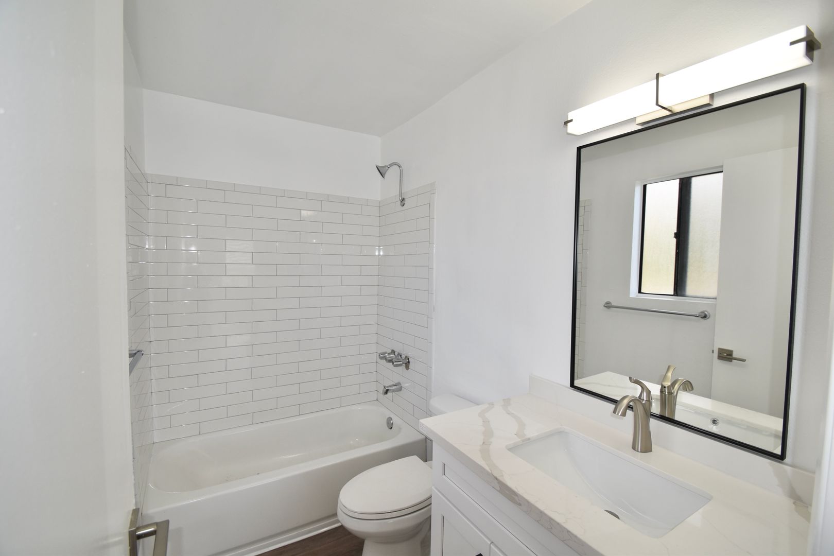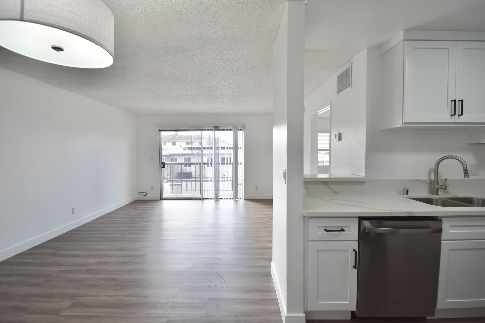 This viewable unit features hardwood style flooring throughout, paired with tile flooring in the kitchen and bathroom for a clean, polished look. The kitchen is finished with granite countertops and a full set of appliances, including a gas stove, refrigerator, and dishwasher.