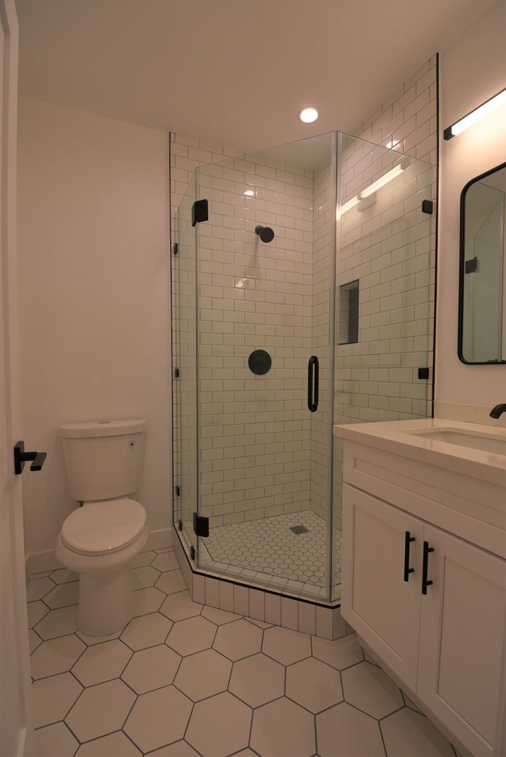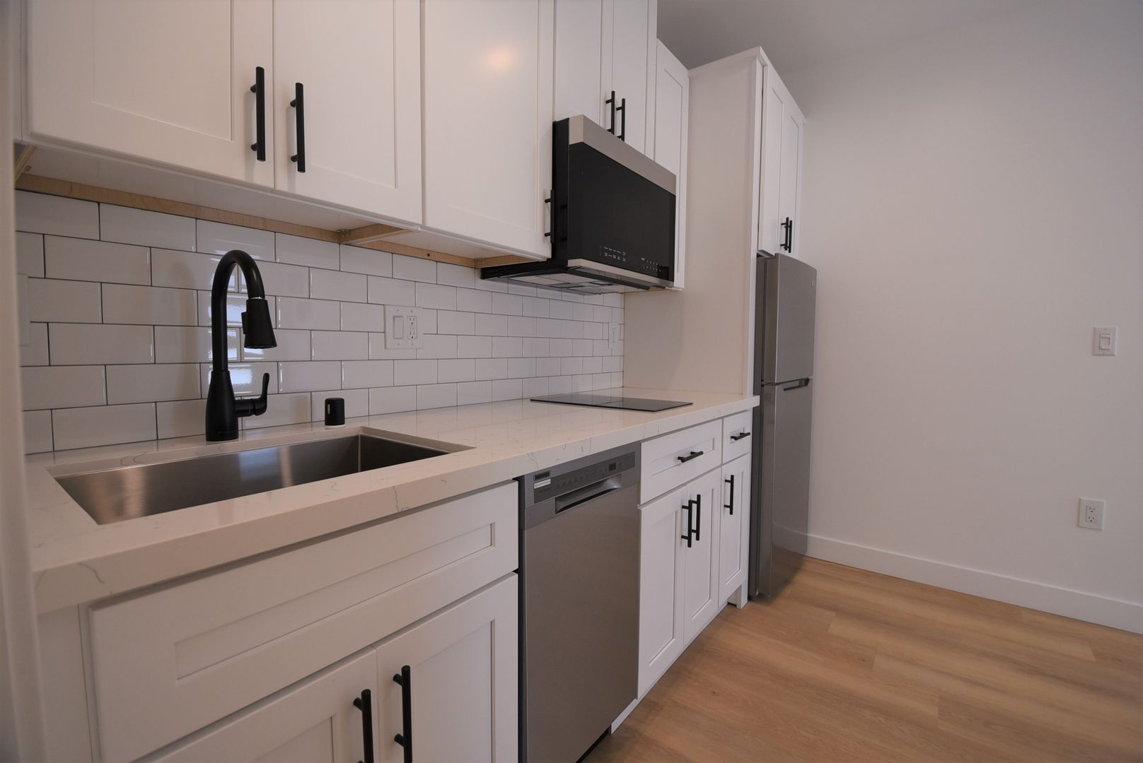 Step inside to find hardwood style flooring throughout, paired with modern hex tile in the bathroom for a stylish contrast. The kitchen shines with white Calacatta-style countertops and a crisp white tile backsplash, creating a bright, clean aesthetic that feels both modern and timeless. A well-appointed appliance package includes a black two-burner