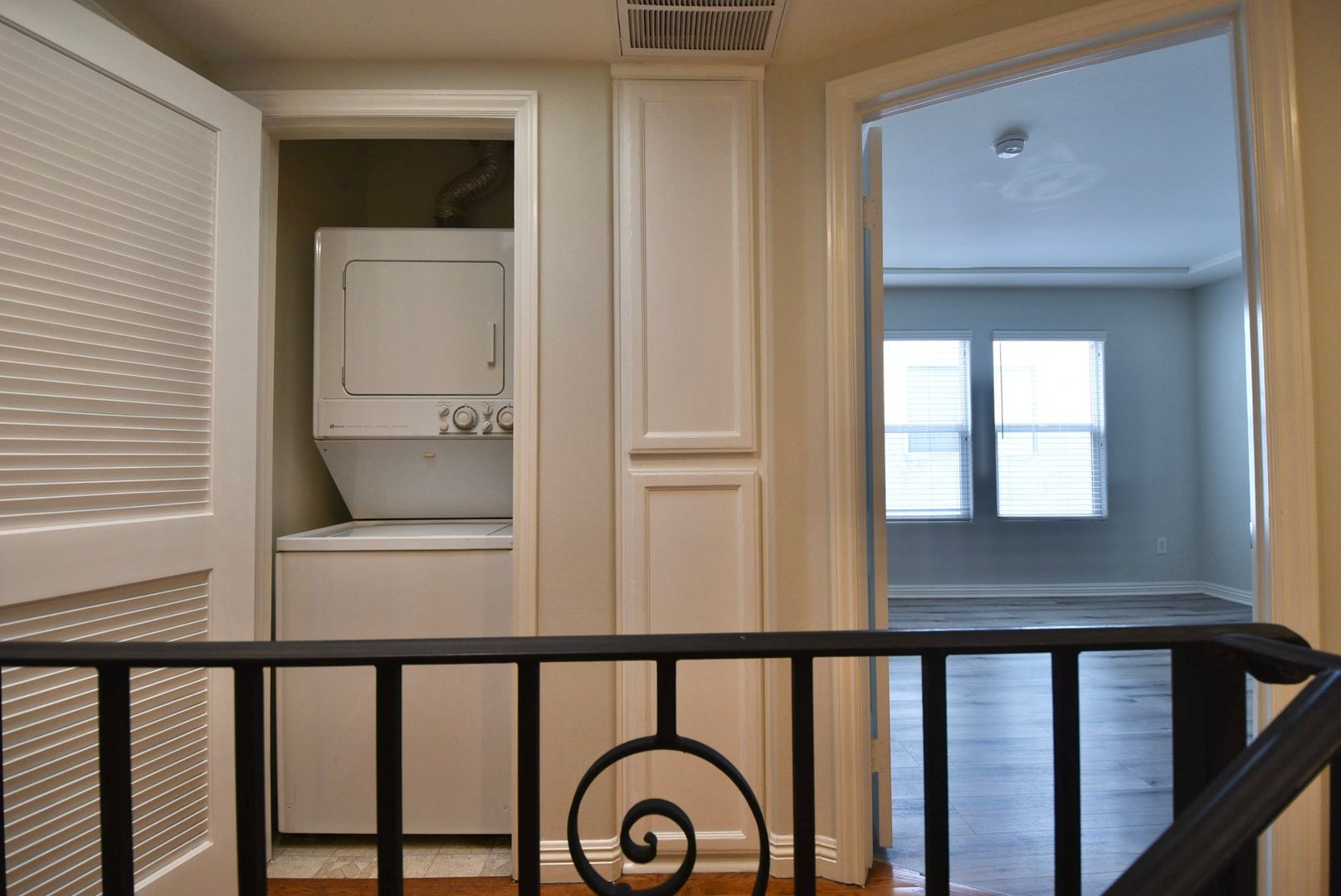 Upstairs, both bedrooms are comfortably sized with plush carpet flooring and walk-in closets, while the bathrooms showcase unique vintage tile finishes that add charm and character. The home also includes a stacked washer and dryer, providing everyday convenience.