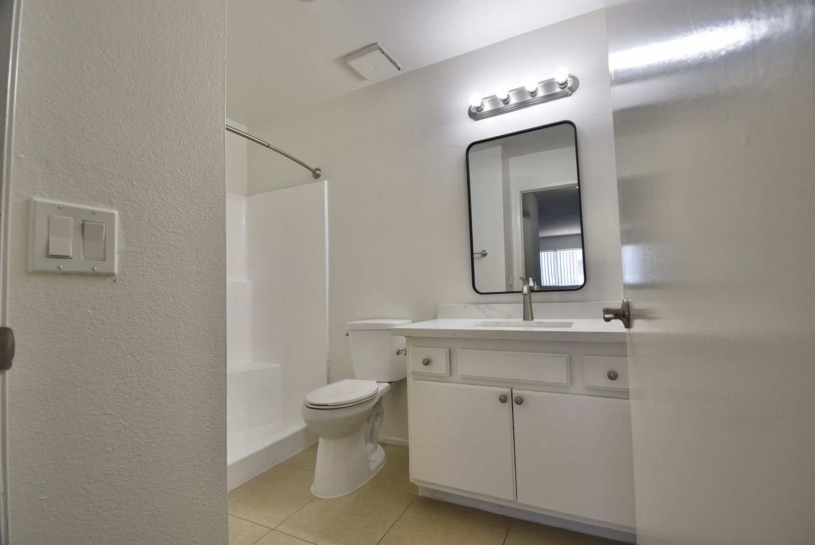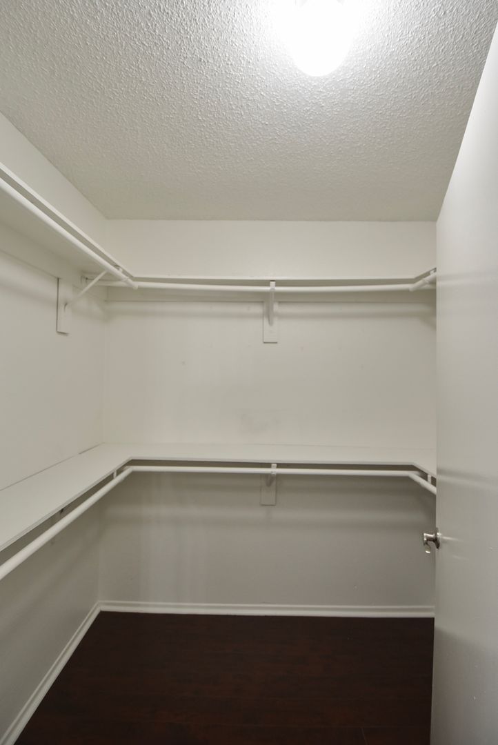 This second-floor unit features elegant mocha hardwood-style floors and calcatta marble quartz counters. The kitchen comes equipped with appliances including a stove, dishwasher, and microhood. Bedrooms are spacious enough to accommodate king-sized beds, and ample closet space ensures plenty of storage.
