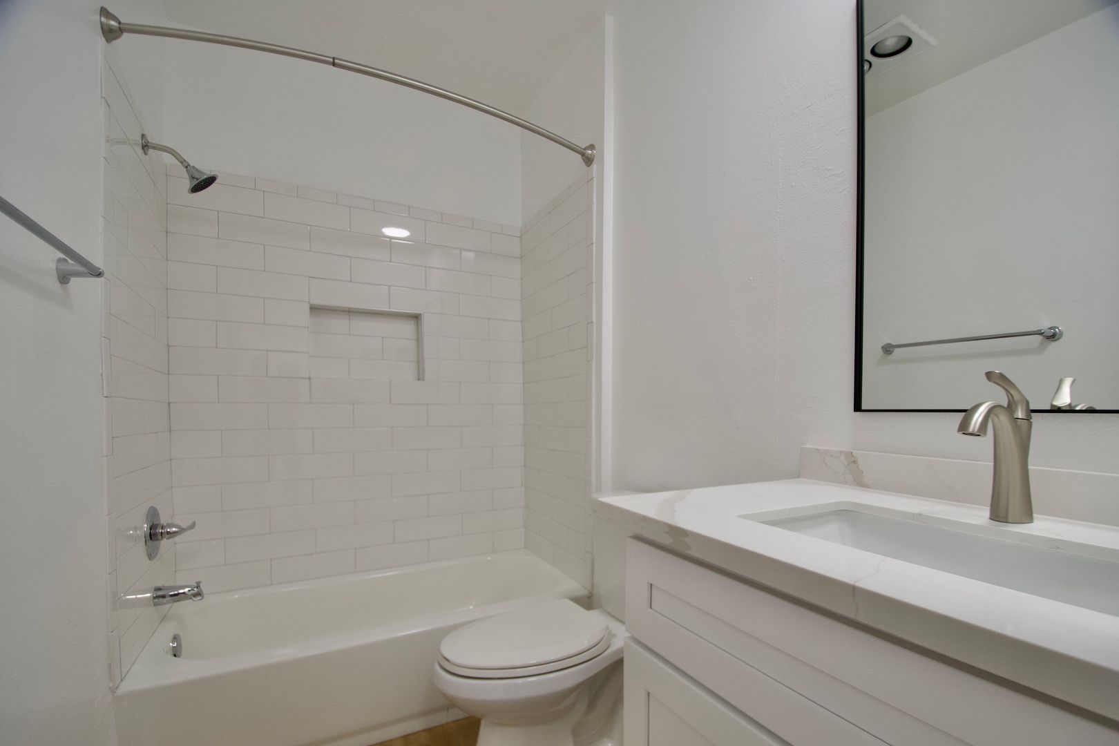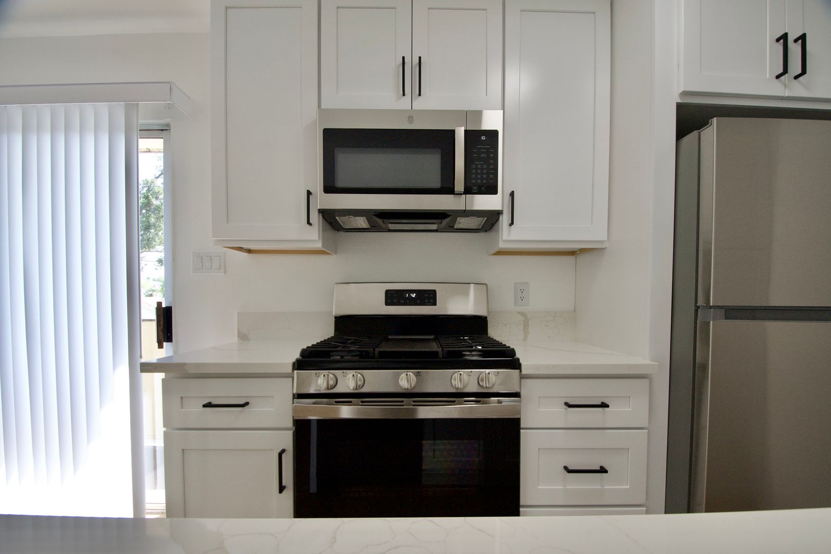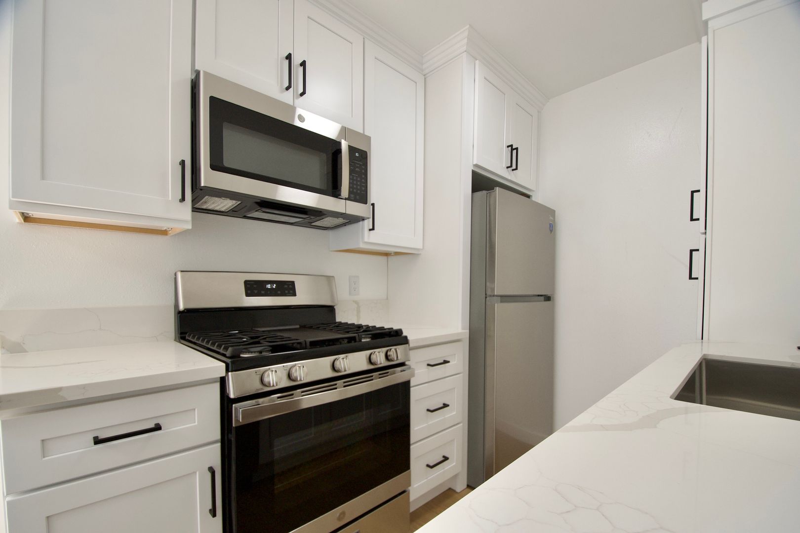 This thoughtfully renovated home features hardwood-style flooring throughout with tile in the kitchen and bathroom, creating a clean and cohesive look. The kitchen is both stylish and functional, offering white quartz countertops with a breakfast bar and a full set of appliances, including a gas stove, micro hood, dishwasher, and refrigerator—perfect for everyday living and entertaining.