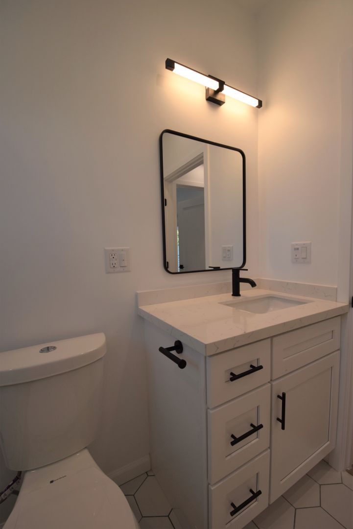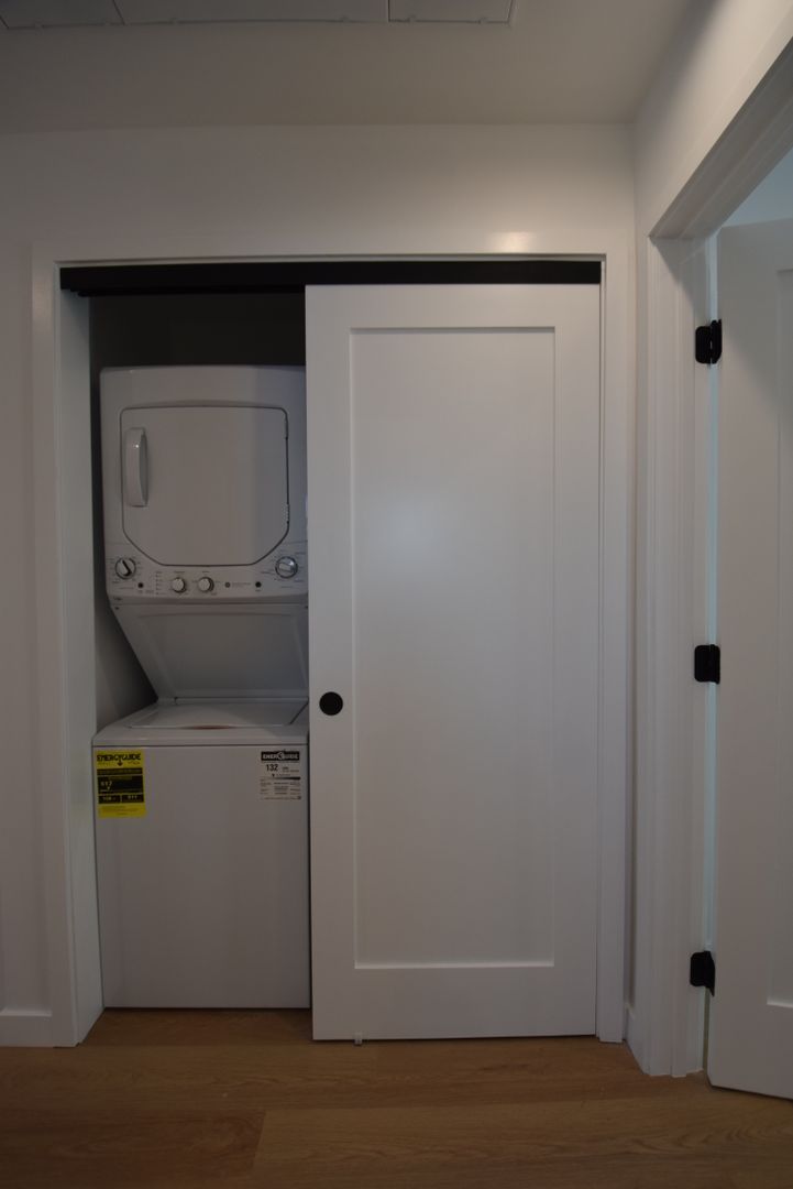 Inside, you’ll find a stylish blend of modern finishes and classic touches, featuring vinyl flooring throughout with hints of original hardwood character and a hex tile bathroom for a clean, contemporary look. The kitchen is well-appointed with white Calacatta-style quartz countertops, a sleek tile backsplash, and a full suite of stainless steel appliances, including a gas stove, micro hood, dishwasher, refrigerator, and pot filler.