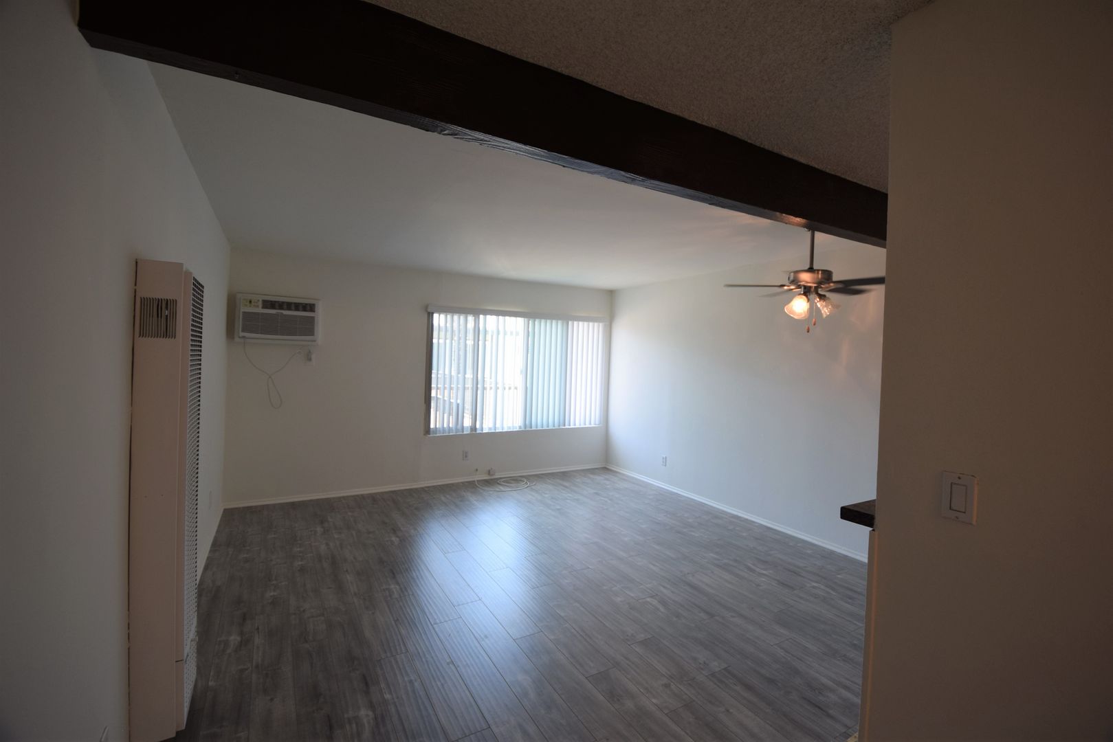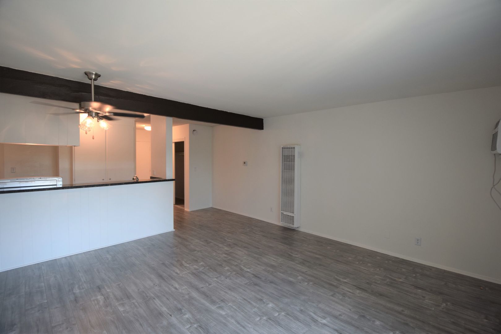 The open layout provides a generous living area filled with natural light, while a large wardrobe closet near the entry offers excellent storage. A ceiling fan, along with wall A/C and heating, ensures year-round comfort.