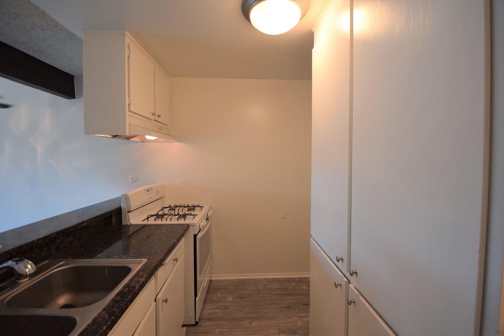 Inside, you’ll find hardwood-style flooring throughout with linoleum in the bathroom, creating a clean and practical living space. The kitchen is both stylish and functional, featuring rose granite countertops with a breakfast bar, a gas stove, vent hood, and ample cabinet storage—perfect for everyday living.