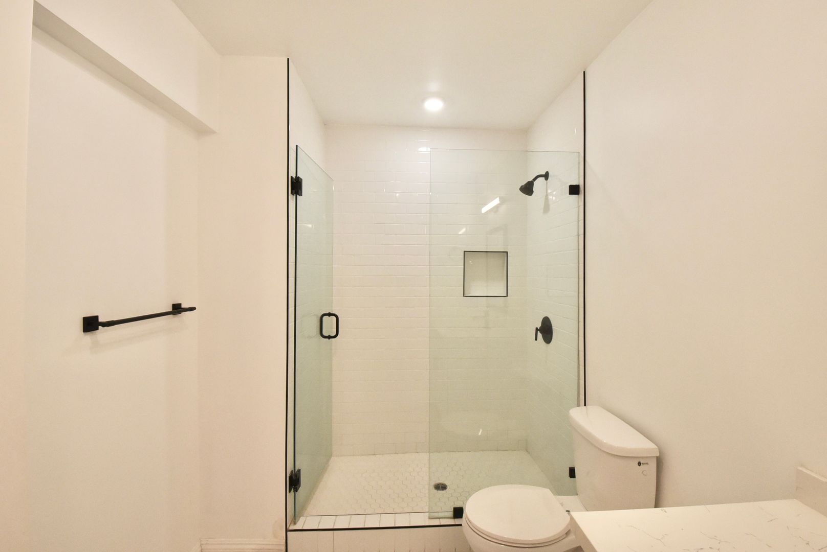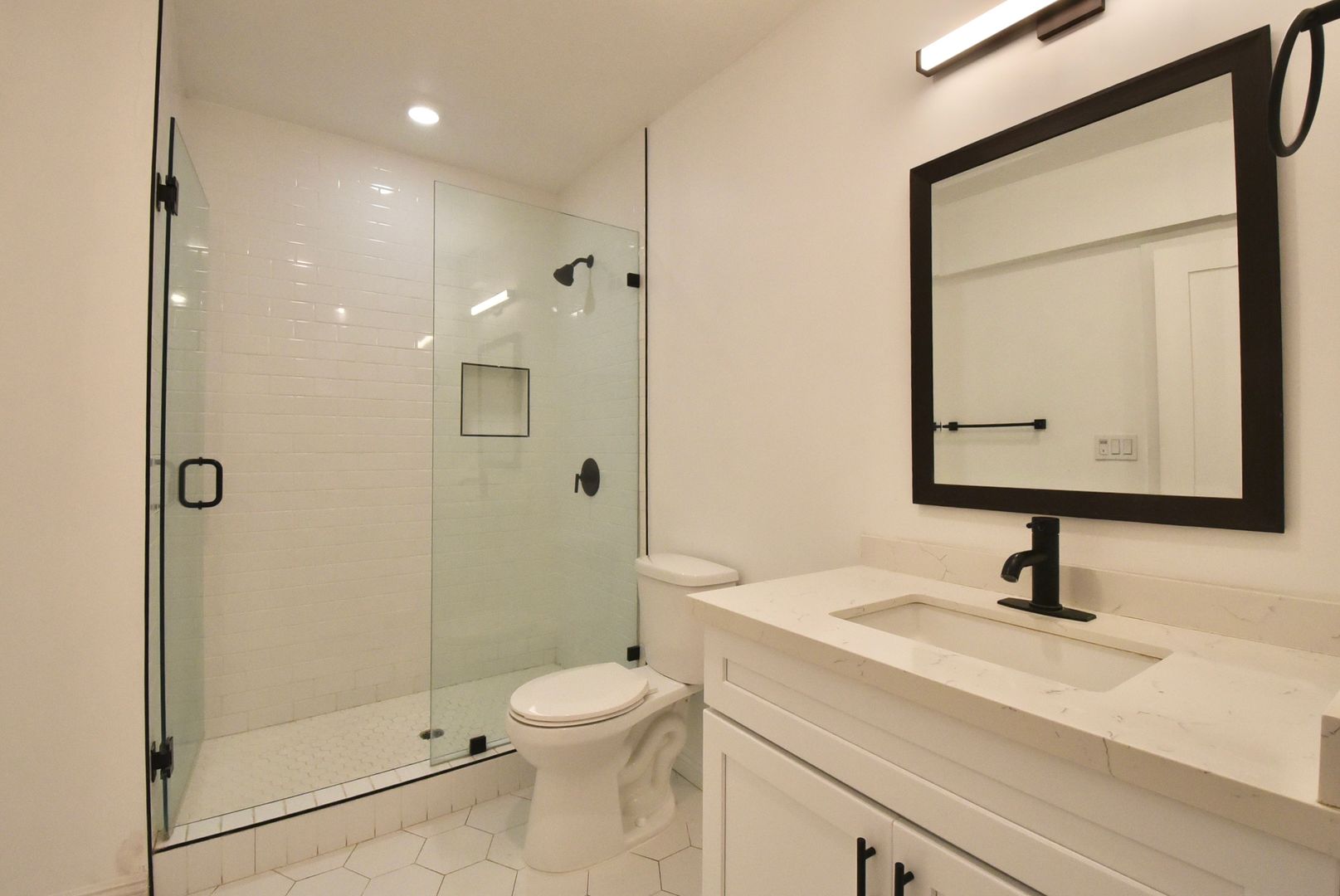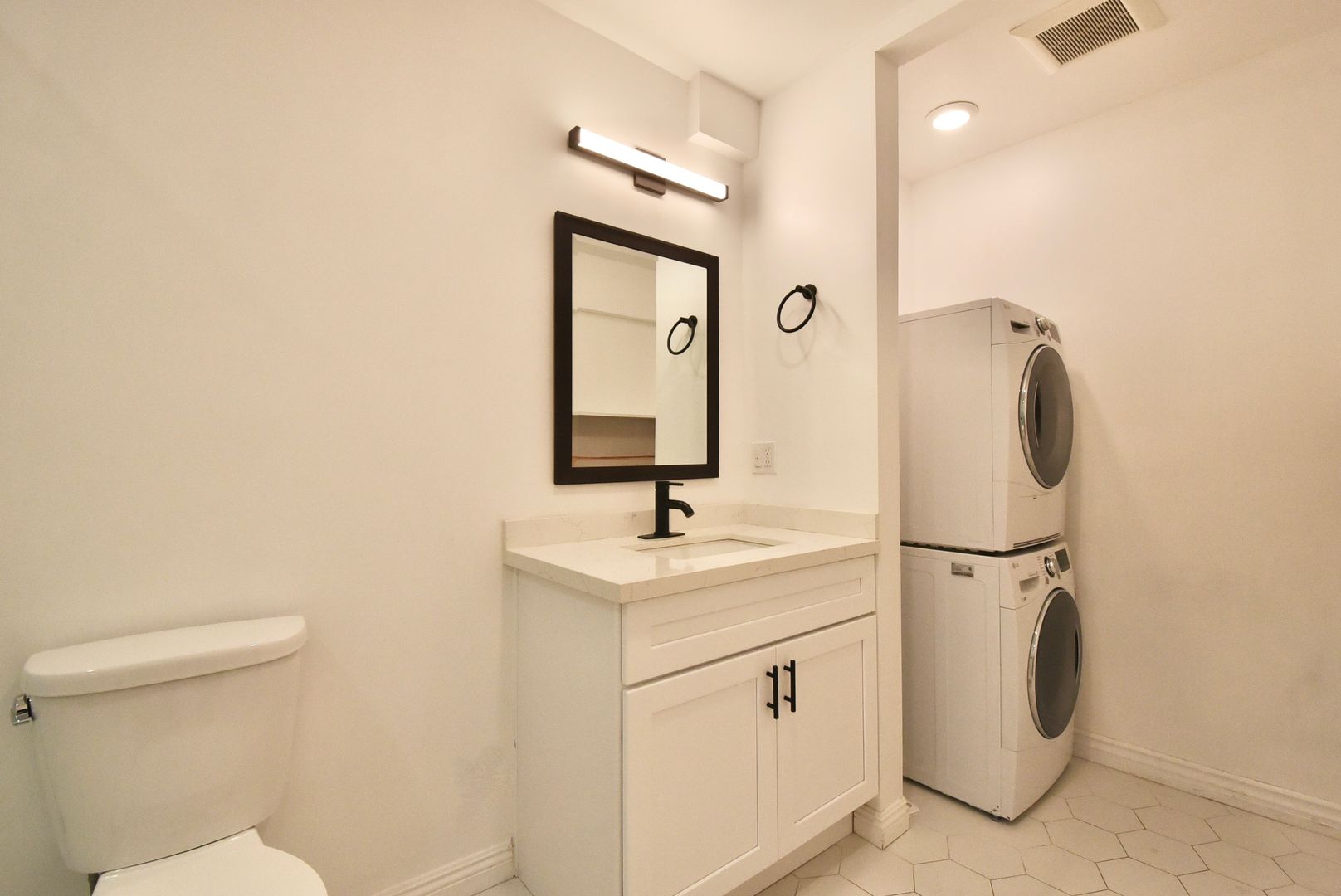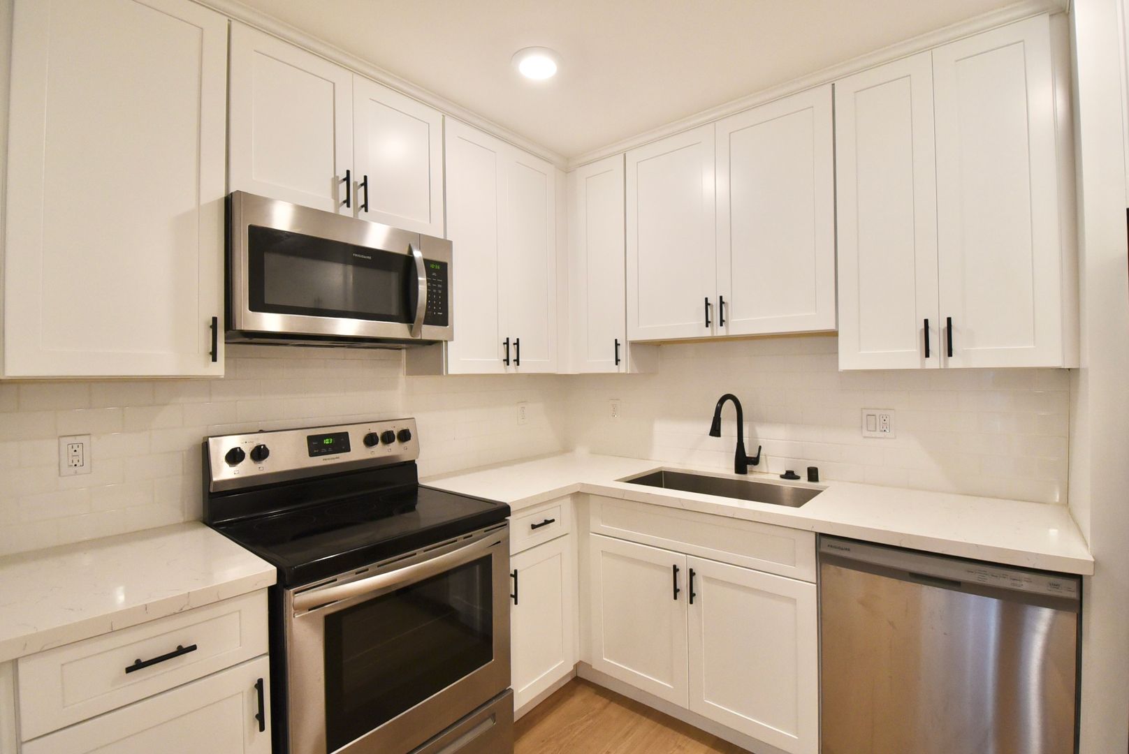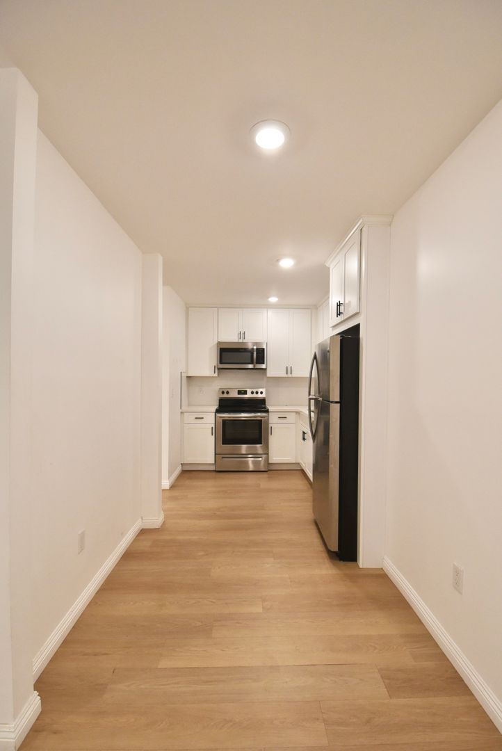 Inside, hardwood-style flooring flows throughout the apartment, creating a sleek and cohesive feel. The kitchen and bathroom feature tile accents paired with stainless steel appliances, including a refrigerator, giving the space a polished and functional design. Recessed lighting throughout enhances the modern aesthetic, while central air conditioning keeps the home comfortable year-round.