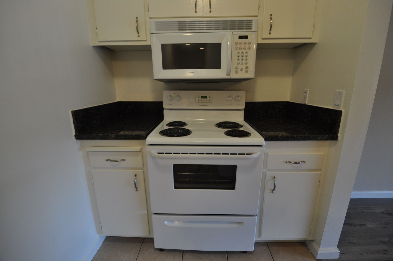 Inside, hardwood-style flooring runs throughout the main living areas, while tile flooring adds durability and style in the kitchen and bathrooms. The kitchen features quartz countertops with a convenient breakfast bar, cabinet storage, and appliances including an electric stove, microhood, and dishwasher. The spacious living room welcomes natural light, creating an inviting atmosphere for everyday living.