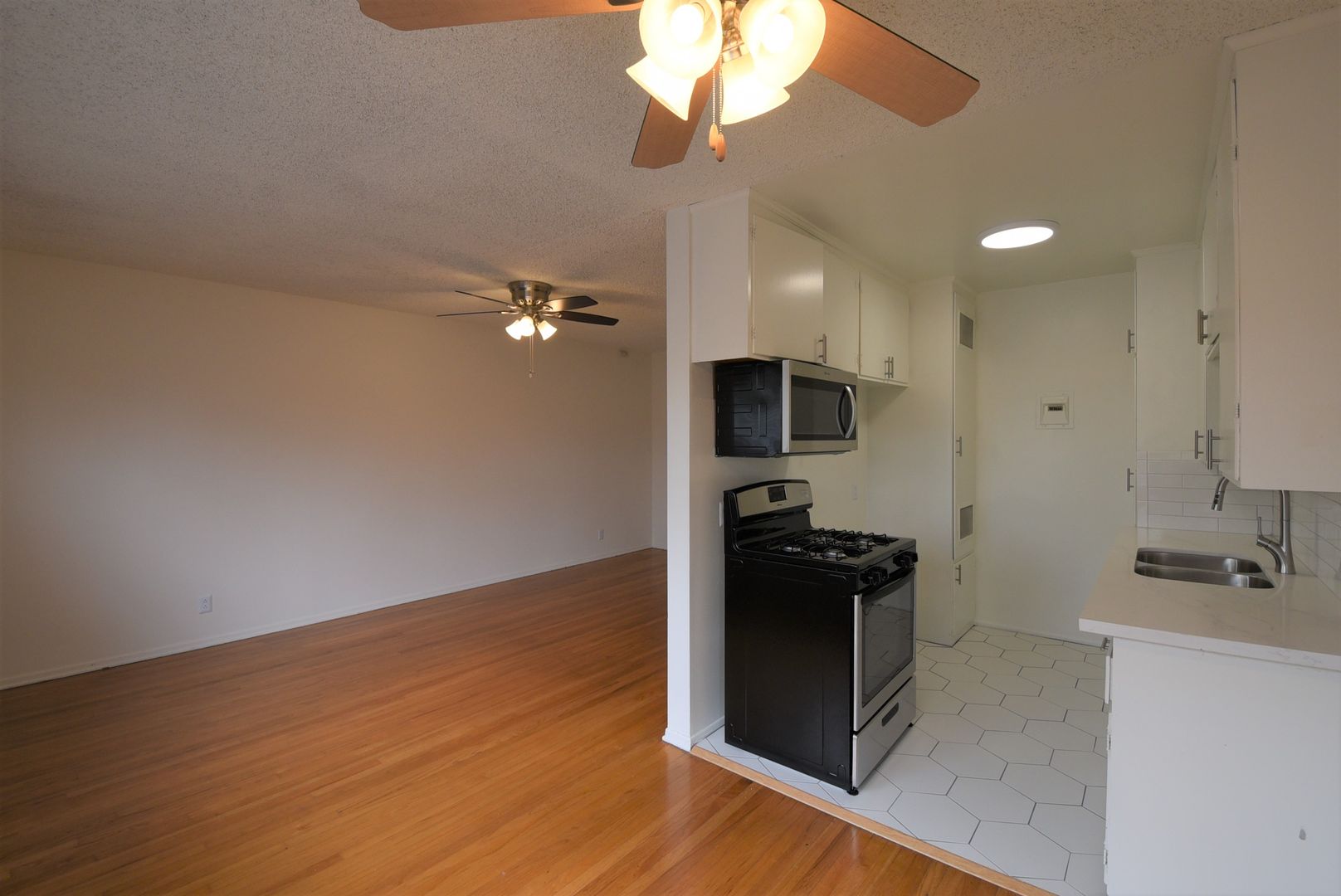 Step inside to find original oak hardwood flooring throughout, paired with stylish hex tile in the kitchen and bathroom for a clean, contemporary look. The kitchen is thoughtfully designed with Calacatta-style countertops and a subway tile backsplash, complemented by stainless steel appliances including a gas stove and micro hood—perfect for both cooking and entertaining.
