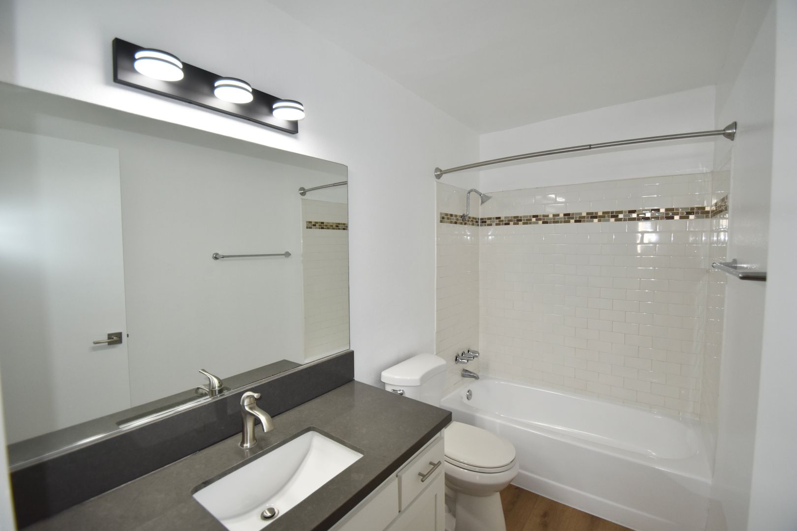 Inside, laminate flooring flows throughout the living space, creating a clean, contemporary feel. The open layout features a look-through kitchen design that enhances sightlines and natural light, making the space feel bright and connected. Quartz countertops in both the kitchen and bathroom pair with a subway tile backsplash in the kitchen for a polished finish, while black electric appliances add sleek contrast. The spacious bedroom