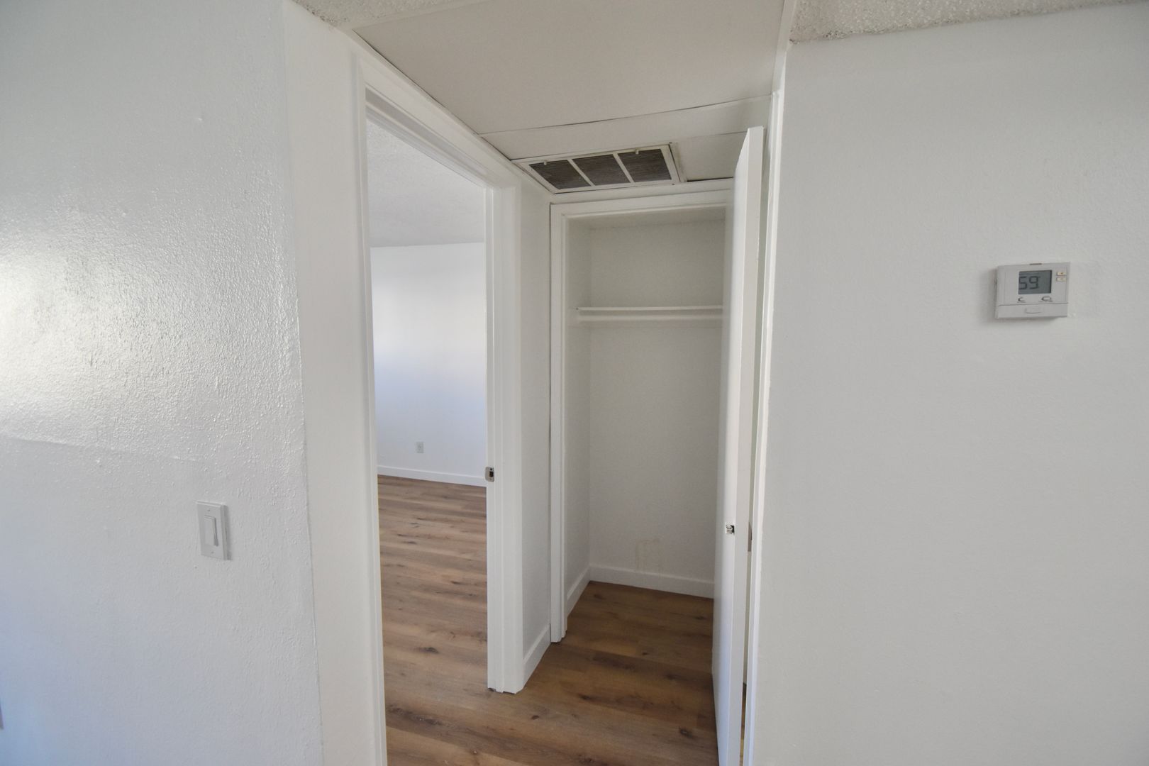 comfortably fits a king-sized bed and includes a large walk-in closet. Additional entry and hall closets provide ample storage, and central air conditioning keeps the home comfortable year-round. Step outside to your private balcony — the perfect place to relax after a long day.