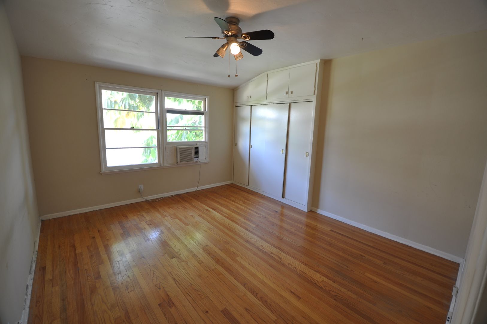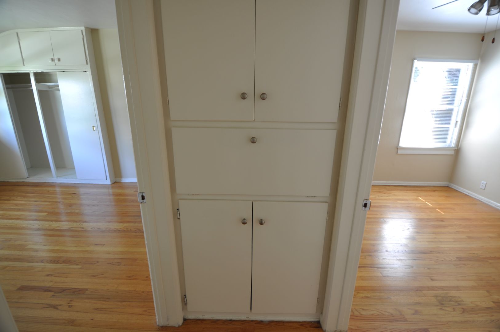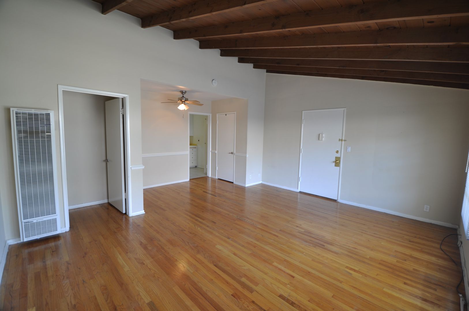 Tucked into a peaceful corner of Sherman Oaks just south of Ventura Boulevard, this charming top-floor apartment blends vintage appeal with a fresh, modern touch. High vaulted ceilings with exposed wood beams and original oak flooring set a warm, airy tone throughout the space. The kitchen has been updated with white quartz counters, clean subway tile, and classic appliances—keeping things stylish without losing its timeless feel.