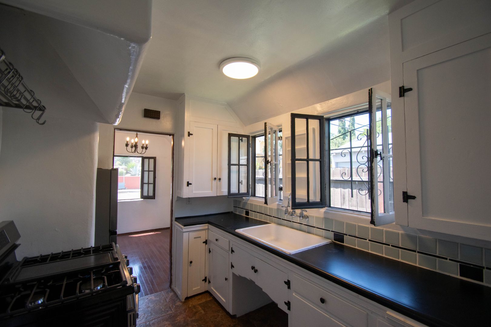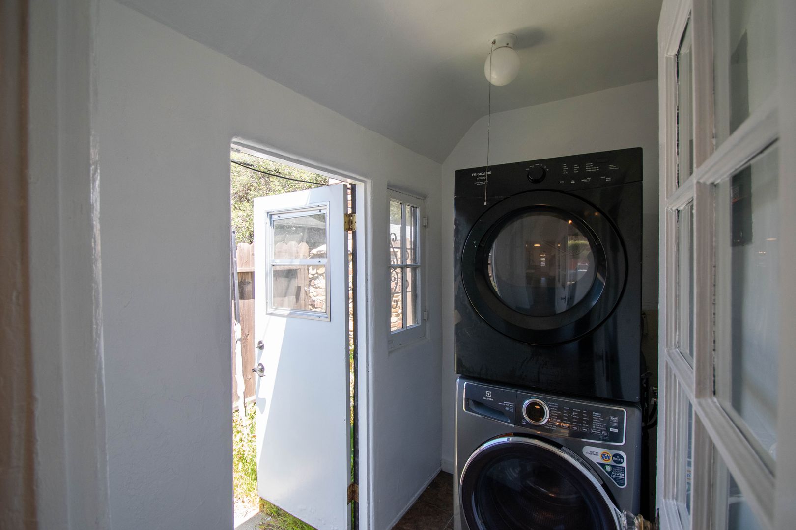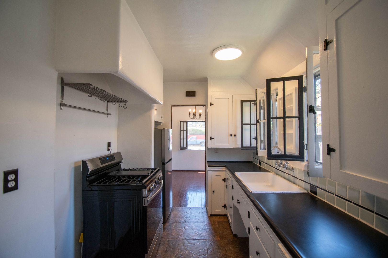 Inside, this charming standalone cottage features original hardwood floors that highlight its vintage appeal, paired with thoughtful updates for modern living. The layout includes a cozy living space anchored by a wood-burning fireplace, along with dual entry points that enhance both flow and privacy. The kitchen blends retro style with functionality, offering black Formica countertops, a white tile backsplash, and a full set of appliances including a gas stove and refrigerator. Additional features like a washer and dryer combo, hall linen storage, and both walk-in and secondary wardrobe closets make this a highly functional one bedroom apartment in Echo Park. A mini-split system in the bedroom provides efficient comfort, while unique tile finishes in the kitchen and bath add to the home’s distinctive character.