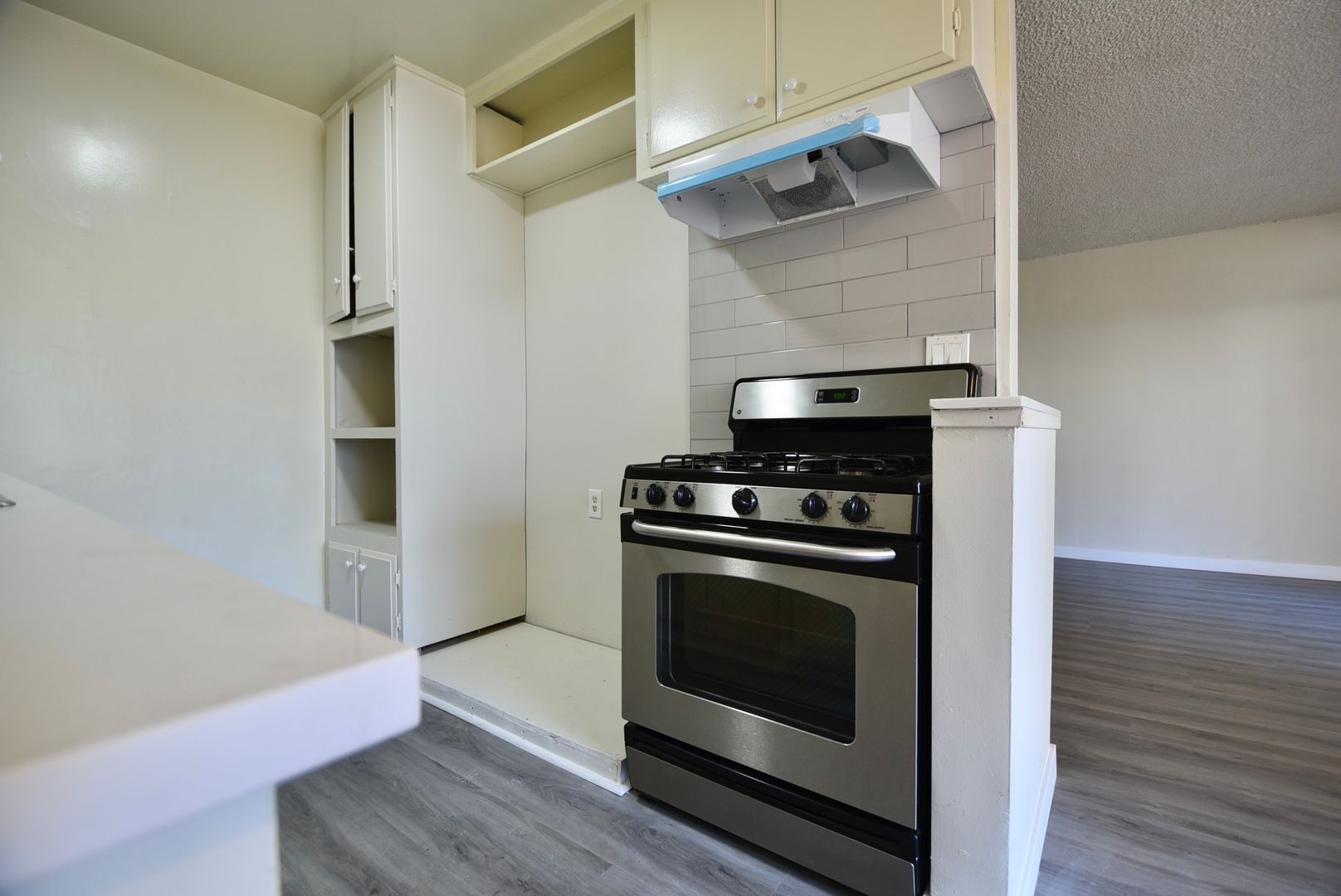 Inside, the home features hardwood style flooring throughout, creating a clean, contemporary look. The kitchen is finished with sleek quartz countertops and tile backsplash, complemented by stainless steel appliances including a gas stove and micro hood. The open layout allows the living and dining areas to flow naturally, making the space feel both welcoming and practical.