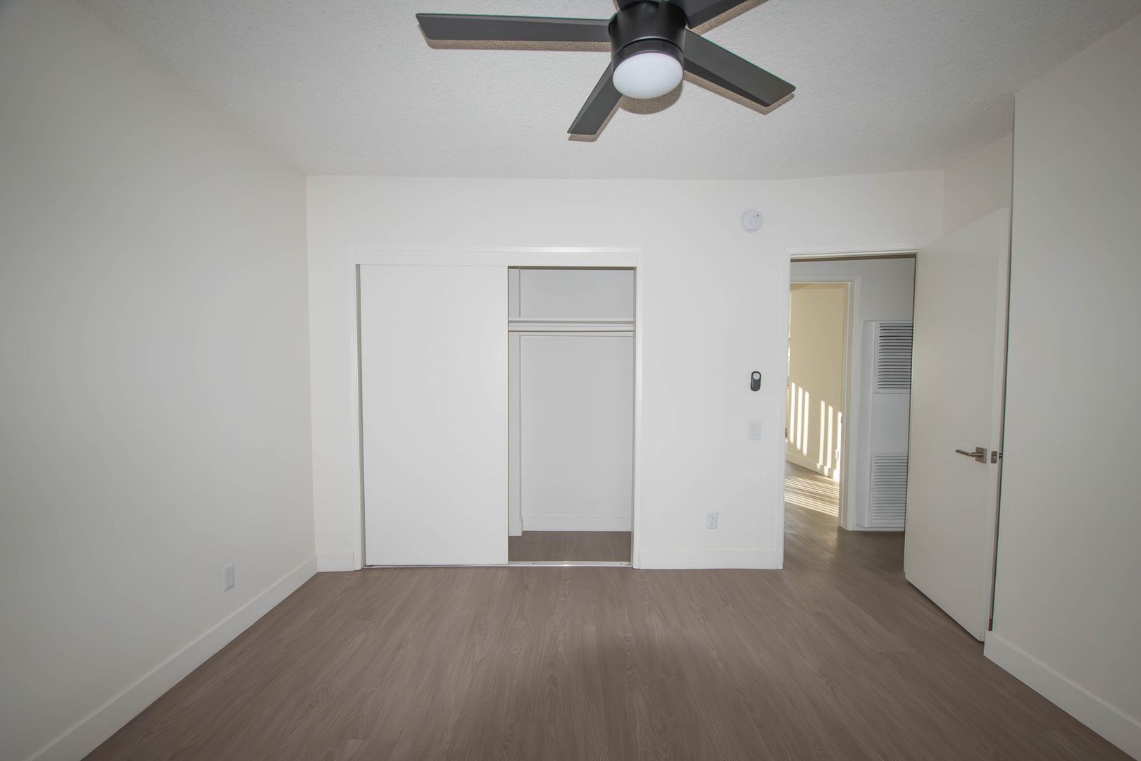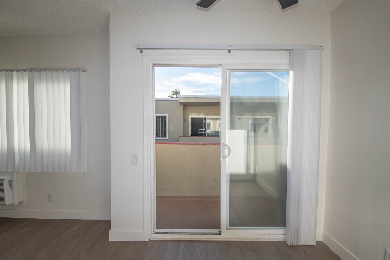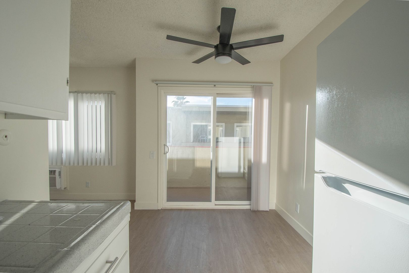 Welcome to 10843 Kling Street, a bright 2-bedroom apartment for rent in North Hollywood, CA 91602 located in the heart of the NoHo Arts District. This first-floor residence offers a spacious, open layout with hardwood-style flooring throughout and abundant natural light in the living room, complemented by a convenient coat closet and adjacent dining area. The kitchen provides generous counter space and cabinetry for everyday functionality, while both bedrooms are comfortably sized for king beds and include ceiling fans for added comfort. A private balcony off the dining area extends the living space outdoors, and a wall A/C unit maintains year-round climate control.