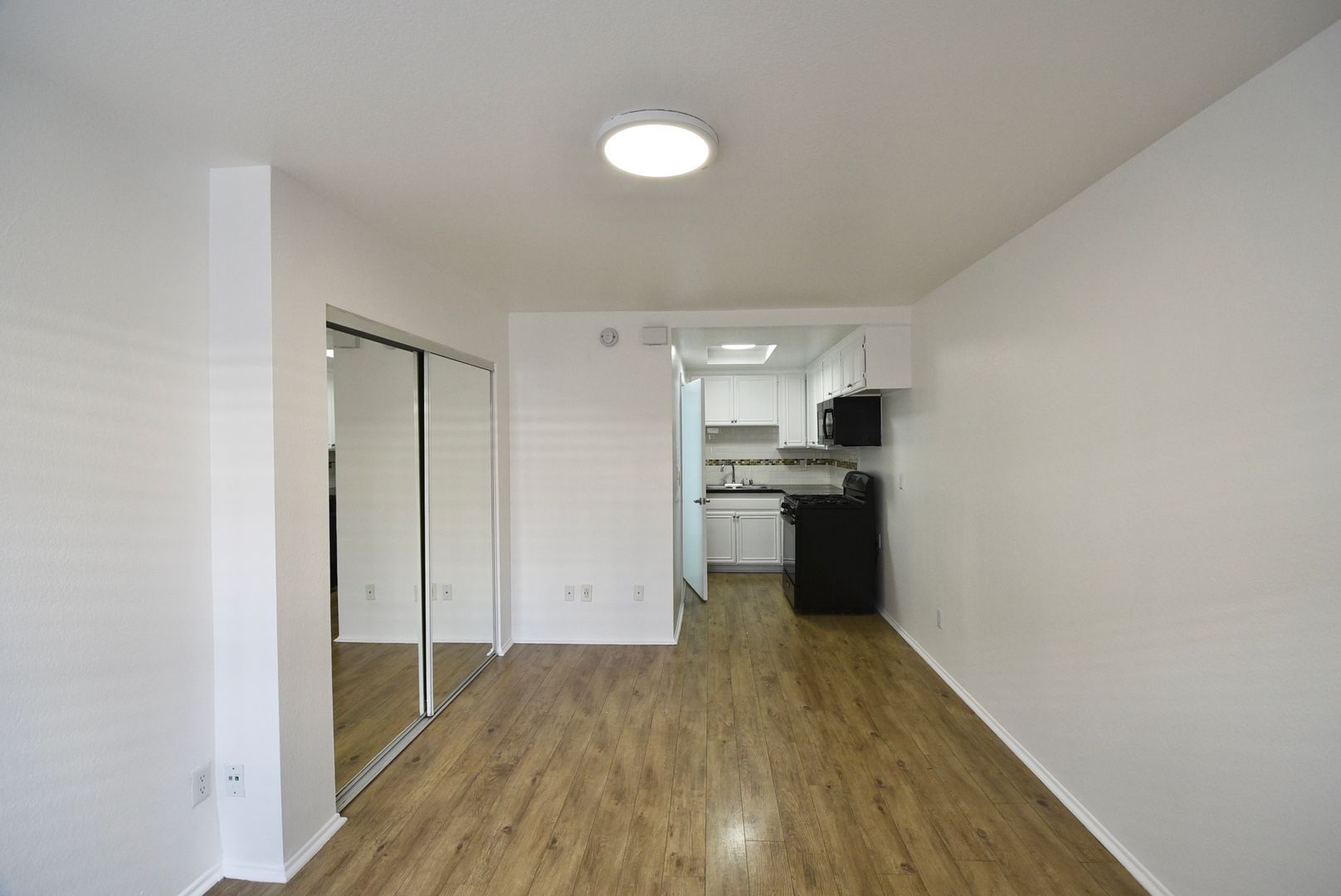 The layout offers smart functionality with a mirrored wardrobe closet that reflects natural light and adds a sense of openness, while built-in shelving provides extra storage to help keep everything organized. A wall-mounted AC and heater unit keeps the space comfortable year-round.