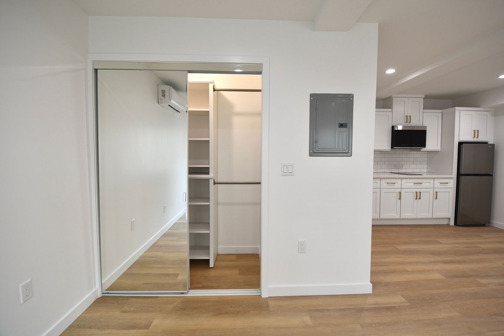 Prepare meals on marble quartz counters accented by modern brass finishes, then unwind in the subway-tile shower with a glass enclosure. Stay comfortable year-round with central A/C. Organize your wardrobe effortlessly with built-in closet shelves and mirror closet doors.
