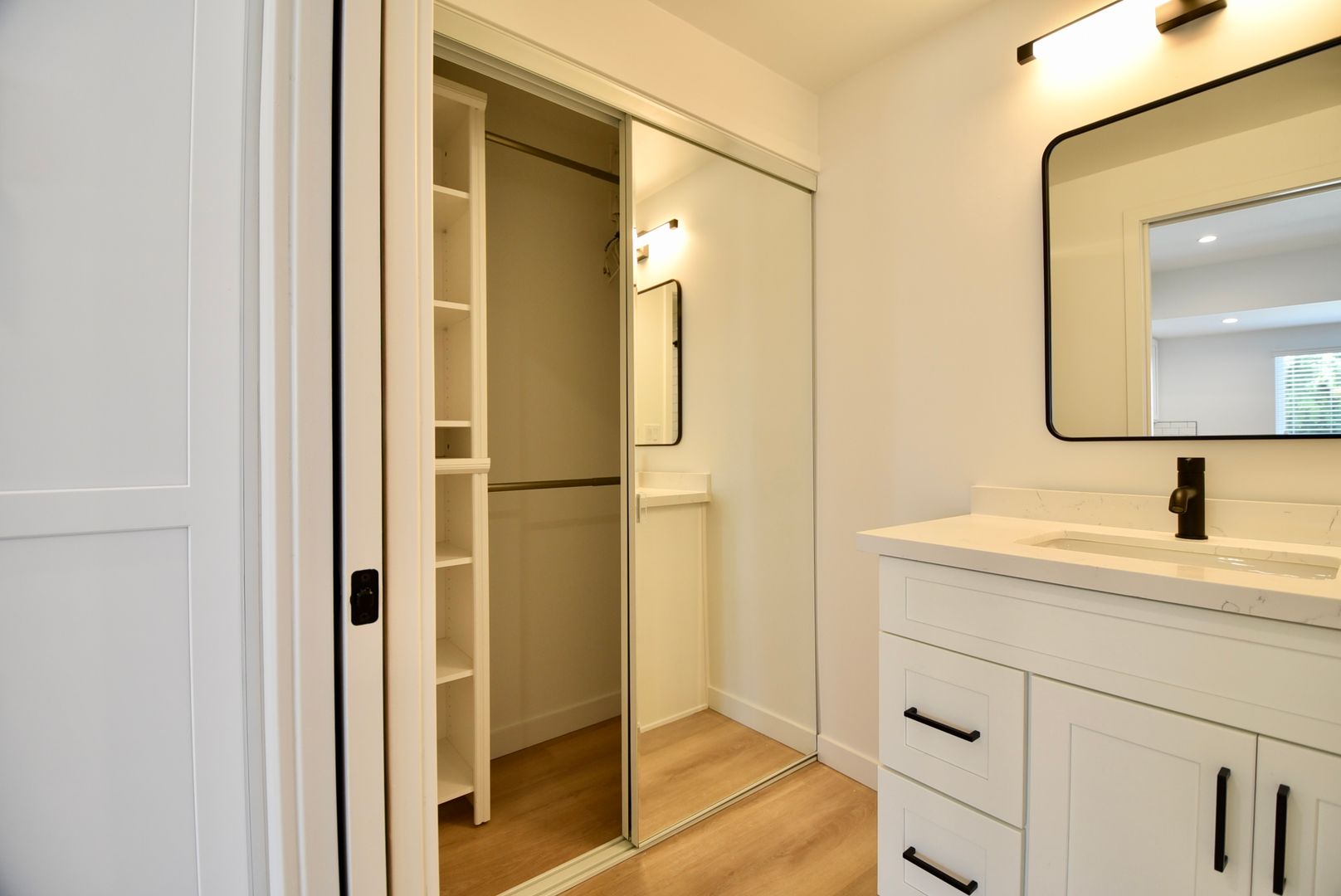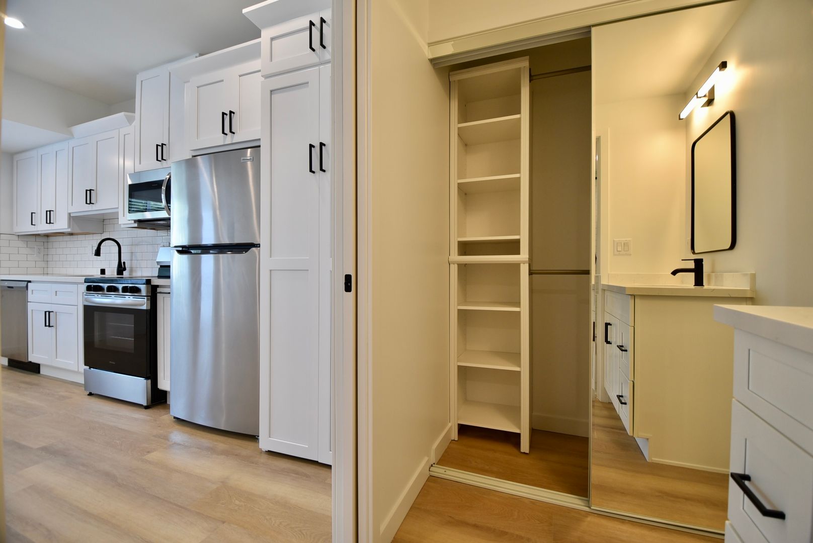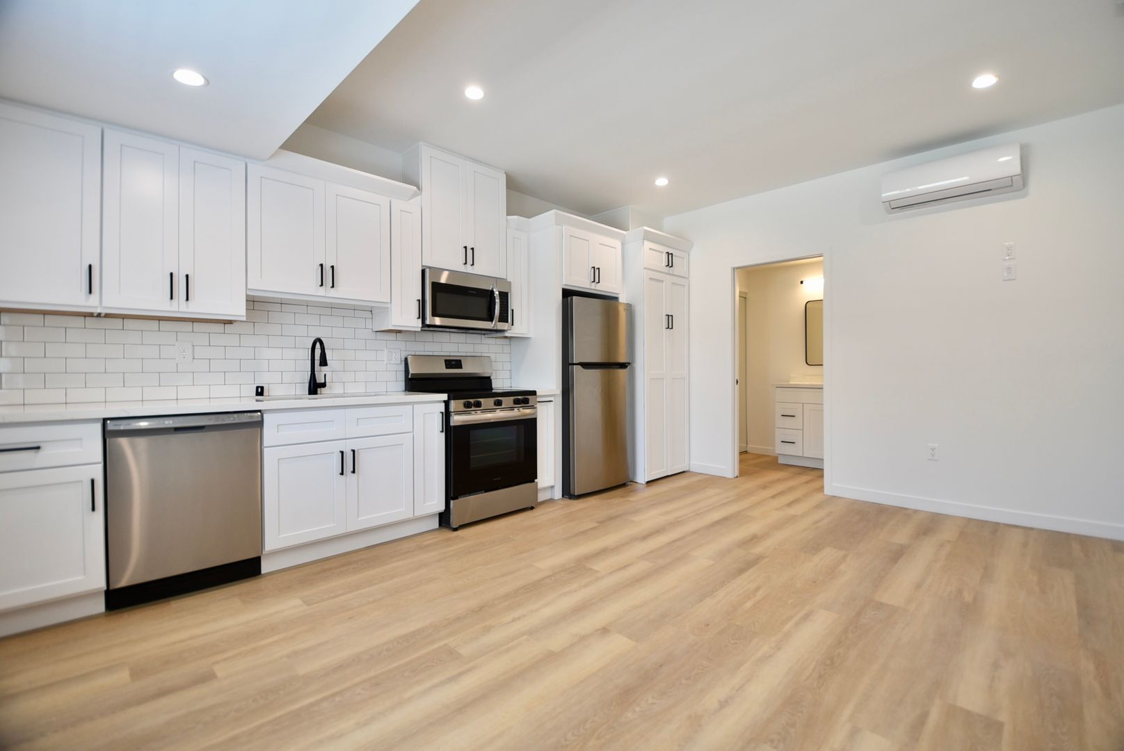 Inside, hardwood-style flooring runs throughout the living space, complemented by white hex tile in the bathroom for a clean, timeless look. The kitchen features quartz countertops with a white tile backsplash and a full stainless steel appliance package, including an electric stove, microhood, dishwasher, and refrigerator. Recessed lighting enhances the bright, modern feel, while a mini-split system provides efficient year-round heating and cooling. A thoughtfully designed separate area includes additional storage, a vanity, and a walk-in shower, maximizing both comfort and usability. A stackable washer and dryer add rare in-unit convenience, and your private patio offers the perfect space to enjoy the California sunshine.