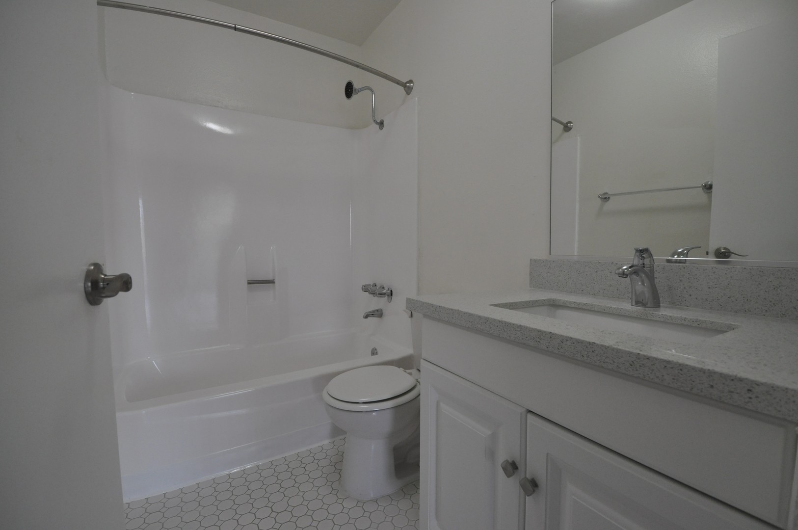 Inside, you’ll find a spacious open layout with hardwood-style flooring throughout and honeycomb tile in the bathroom, creating a clean and modern feel. The kitchen features sleek quartz countertops and comes equipped with black electric appliances, including a stove and micro hood, blending style with functionality.