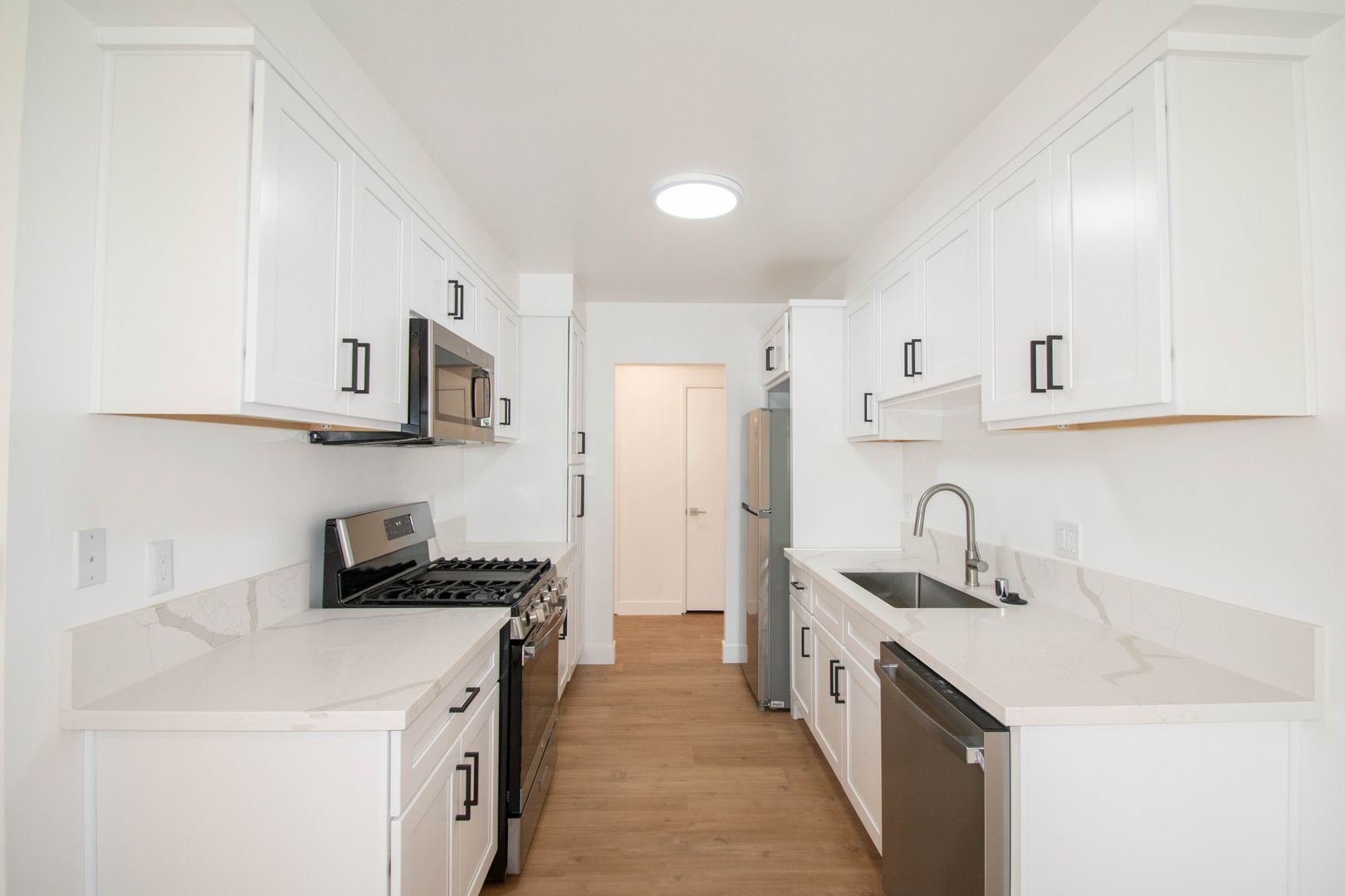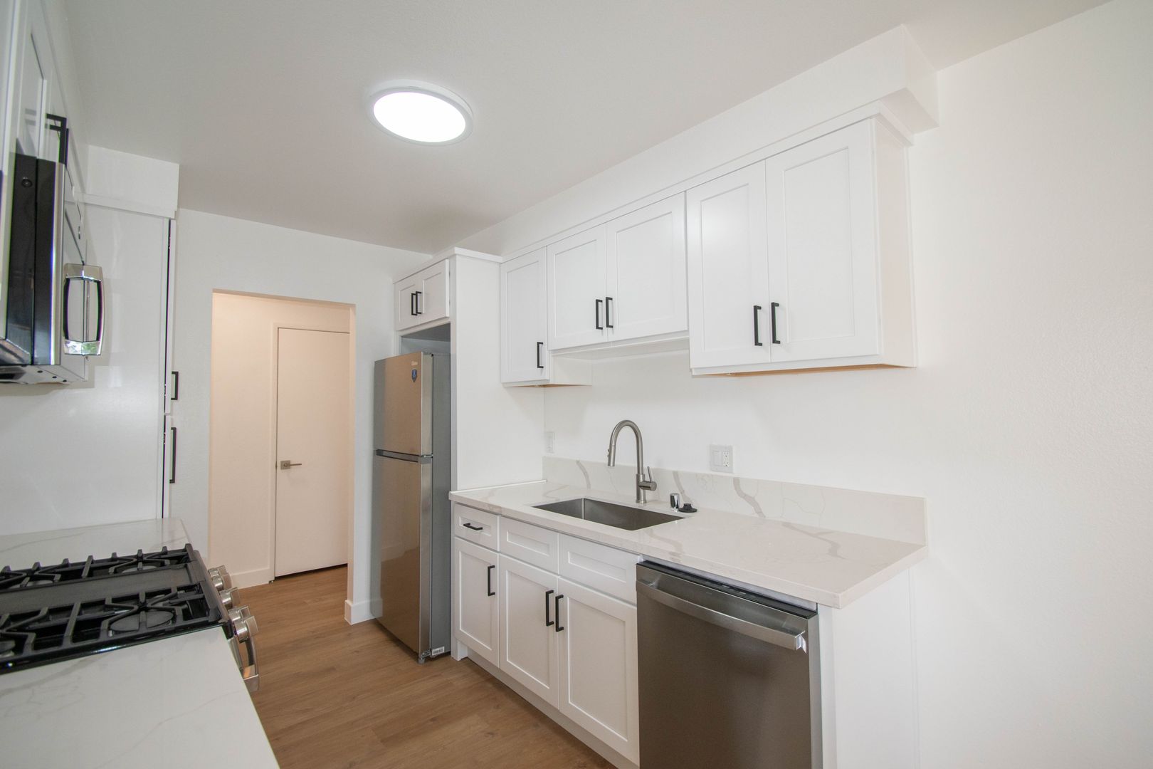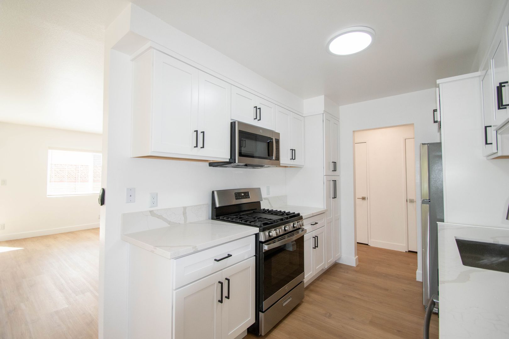 Inside, this thoughtfully updated home features hardwood-style floors throughout. The layout is designed for comfortable living, with an extra spacious living room that opens to a large enclosed patio—perfect for relaxing or entertaining. A generous dining area sits just off the kitchen, which offers excellent counter space and storage along with upgraded stainless steel appliances. Additional highlights include two entry closets, hallway linen storage, and king-sized bedrooms with ceiling fans, creating a functional and inviting three bedroom apartment in Newhall.