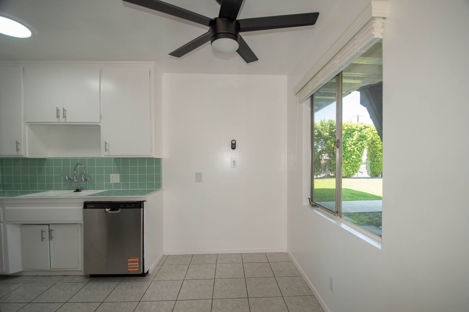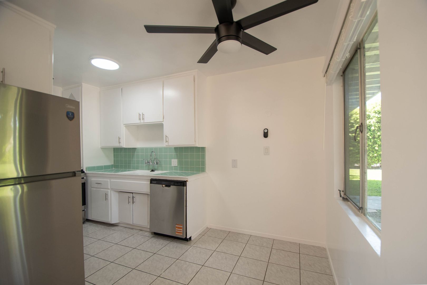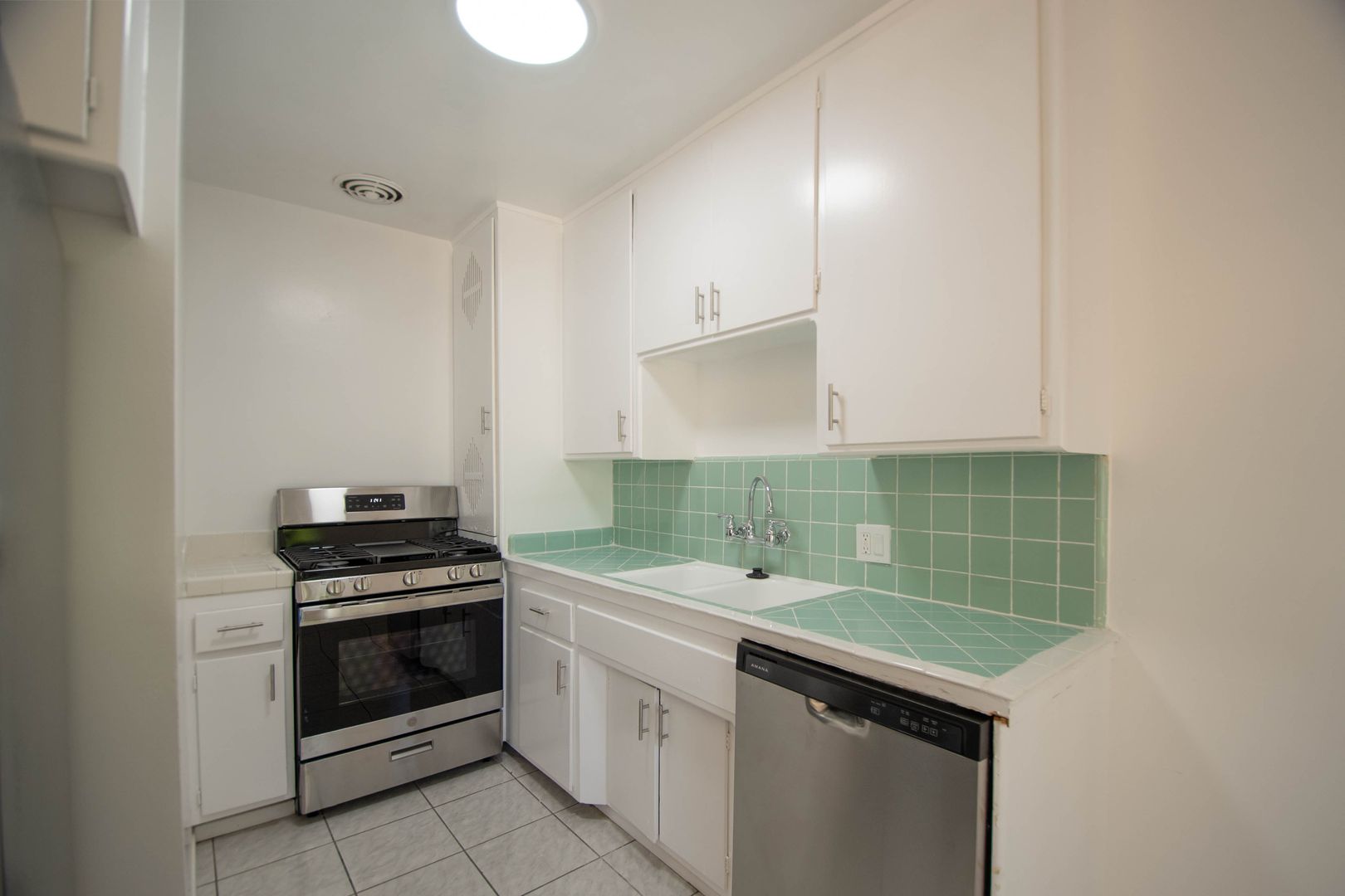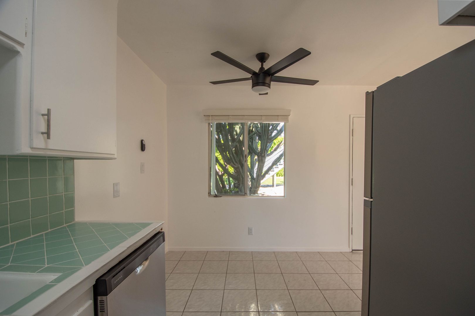 Inside, you’ll find hardwood-style floors throughout and a spacious living room filled with natural light, complete with a jacket closet for added storage. The kitchen features vintage tile countertops, new stainless steel appliances including a gas stove and dishwasher, and a dining area with a ceiling fan for everyday comfort. A linen storage cabinet in the hallway keeps everything organized, while the queen-sized bedroom includes a ceiling fan and a relaxing atmosphere.